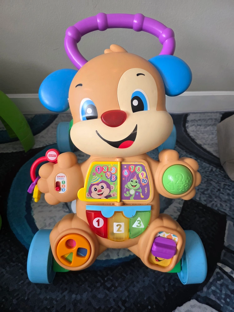 A Fisher-Price Laugh & Learn walker. Features a dog-like design with multiple colours. Various interactive buttons and activities. Perfect for helping little ones find their balance while having fun.