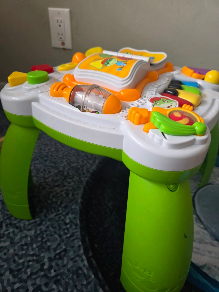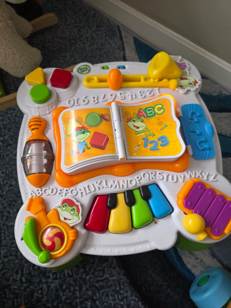 A learning table, with a white and green base. Various shapes, colours and musical instruments. Such a wonderful tool to nurture a child's early development skills.