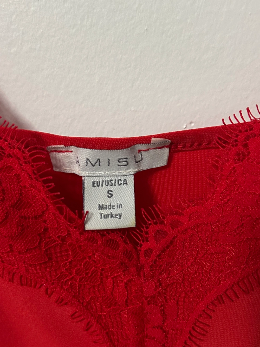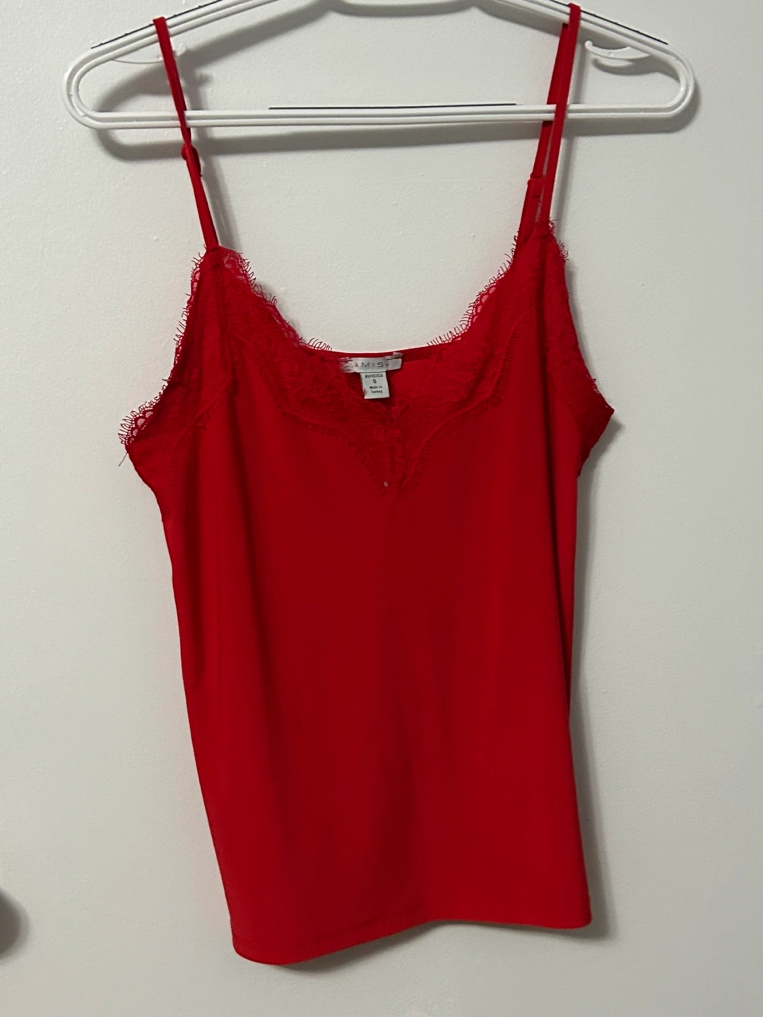 Red cami top. Spaghetti straps. Lace detailing along the neckline. A great addition to any wardrobe. I hope this item provides you with many restful nights.