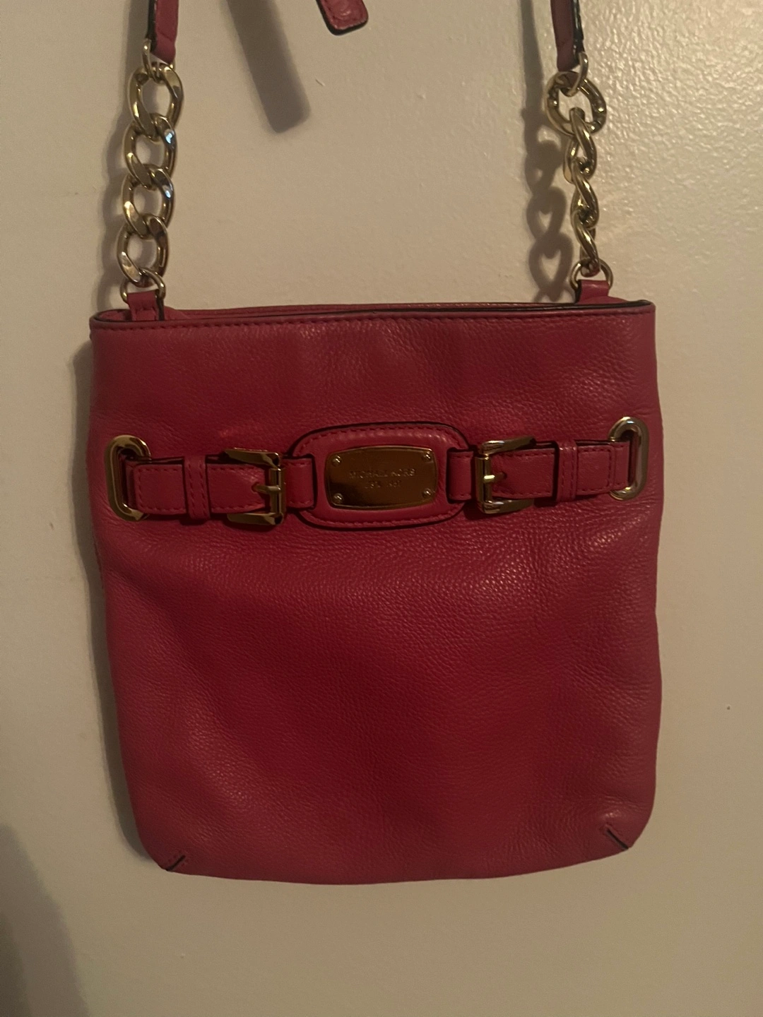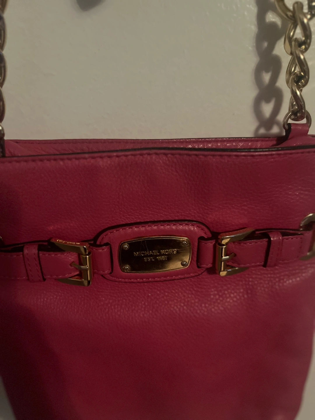 Beautiful pink bag, perfect for everyday use. Featuring a crossbody strap with chain detail. The bag has gold-tone hardware and a zippered interior. This lovely bag will brighten your day.