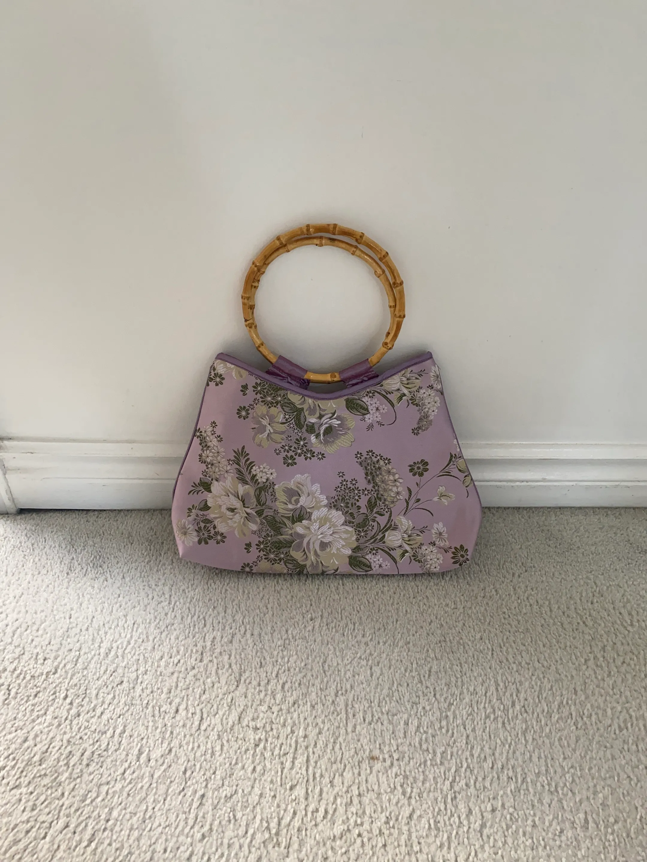 A beautiful handbag with a floral design. The handle is made of bamboo. The bag is a lovely shade of lavender, with white and green flowers. You can take this bag with you wherever you go for a nice, relaxing day.