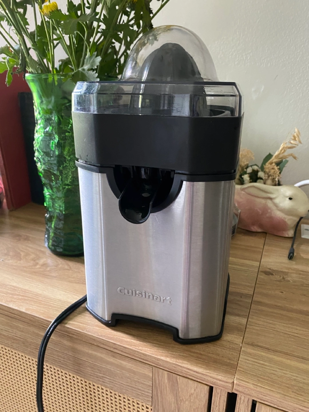 It could be a great way to start your day feeling refreshed. Juicer in a stainless steel finish. Features a black plastic top and a clear plastic lid. Has a pour spout.