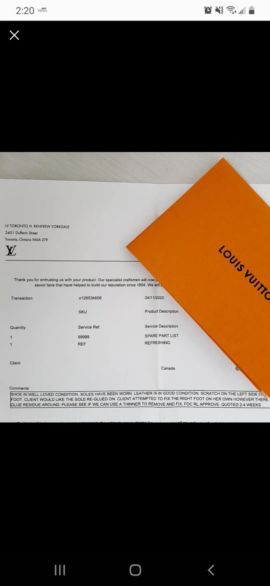 It's recently sent to the LV shop to fix the sole which was a bit opened before. There is some glue mark around the edges which I was attempted to glue it myself. So the repair note from the store can prove authenticity.