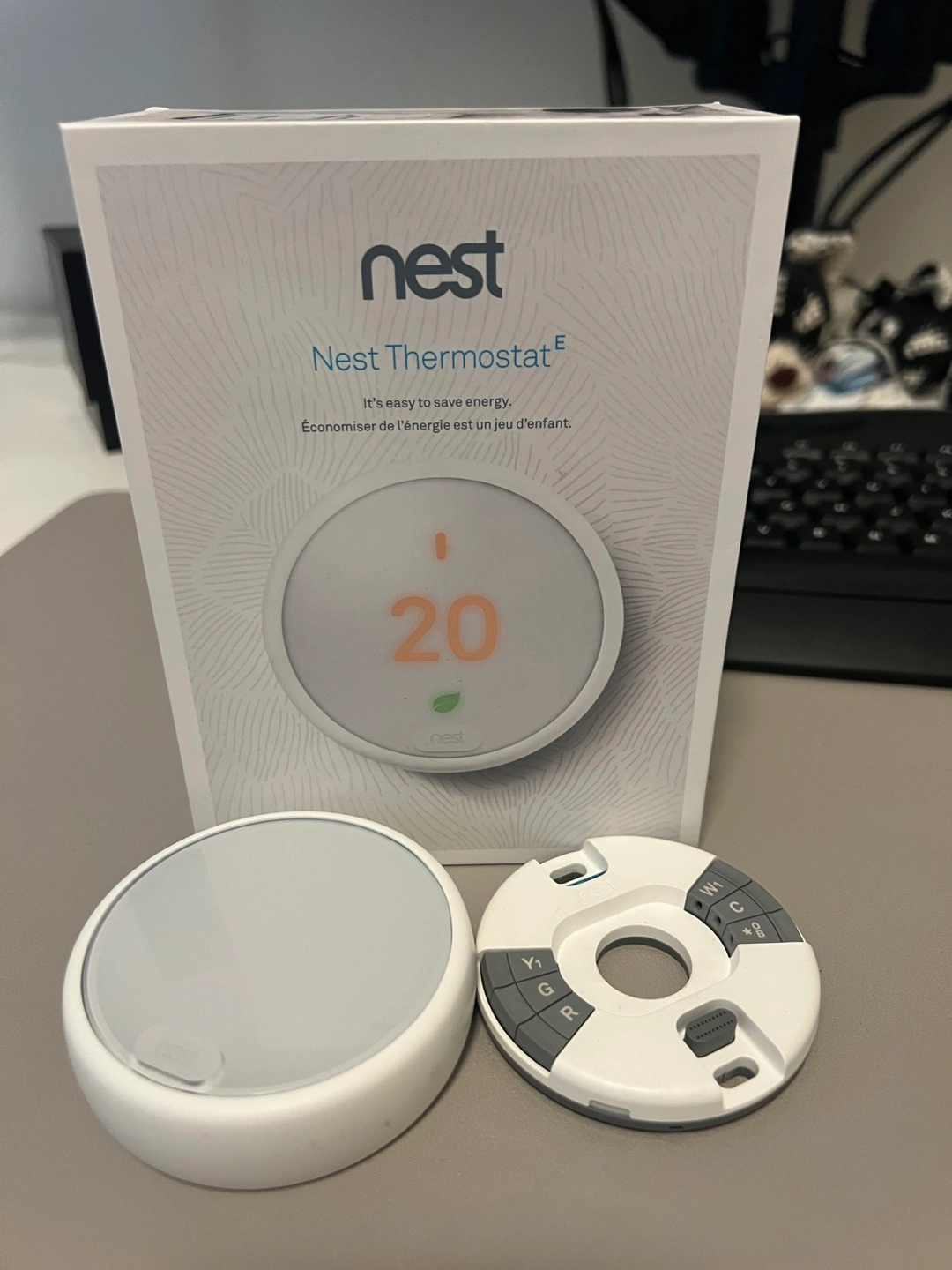 Comes with the thermostat, the base and a few mounting pieces. The packaging is there too. A good way to make your home more comfortable and energy efficient.