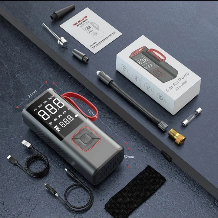 BRAND NEW :: A black and grey car tire inflator. Included are a variety of nozzles for bikes, scooters etc. The inflator also has a large digital display. This item would be great for ensuring safe travels.