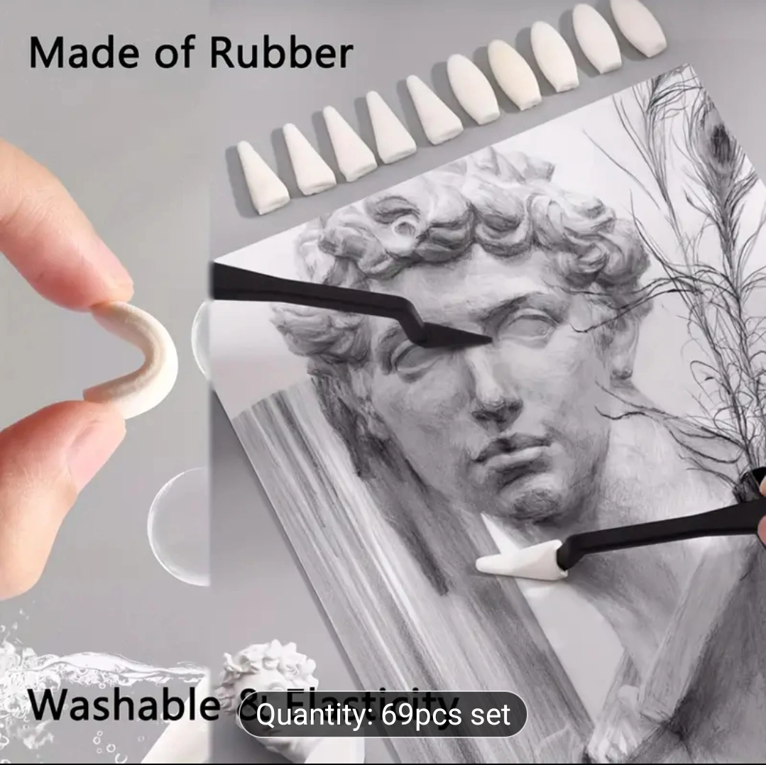 A complete new set of art supplies. 49 pieces including pencils, blending stumps, and other art tools. It also comes with a carrying case and belt for easy storage and transport, making it perfect for artists on the go.