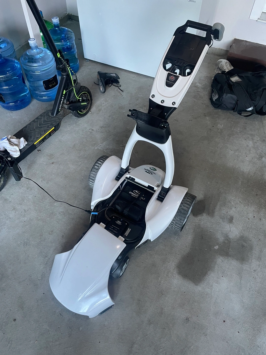 Offering a automatic golf Stewart. With a black and white top. Features a handle. The cart has three wheels. And automatically follows you Taking the golf cart on the course can be a very relaxing activity.