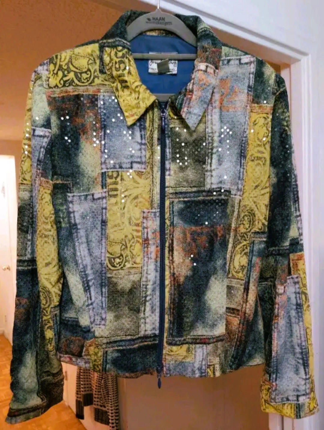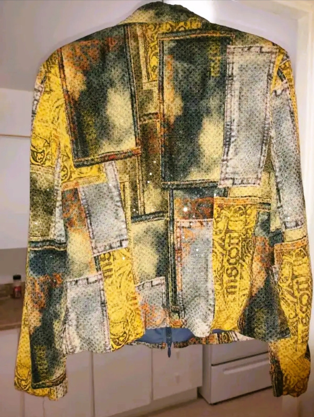 Unique patchwork denim with subtle clear sequin detailing
