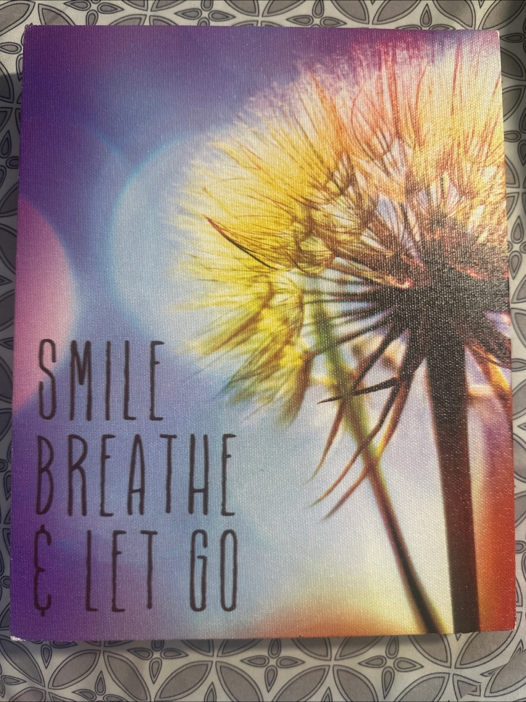 A canvas 8x10 art piece with inspirational words and a colourful, flowery design. A great addition for a calming space/simple decor