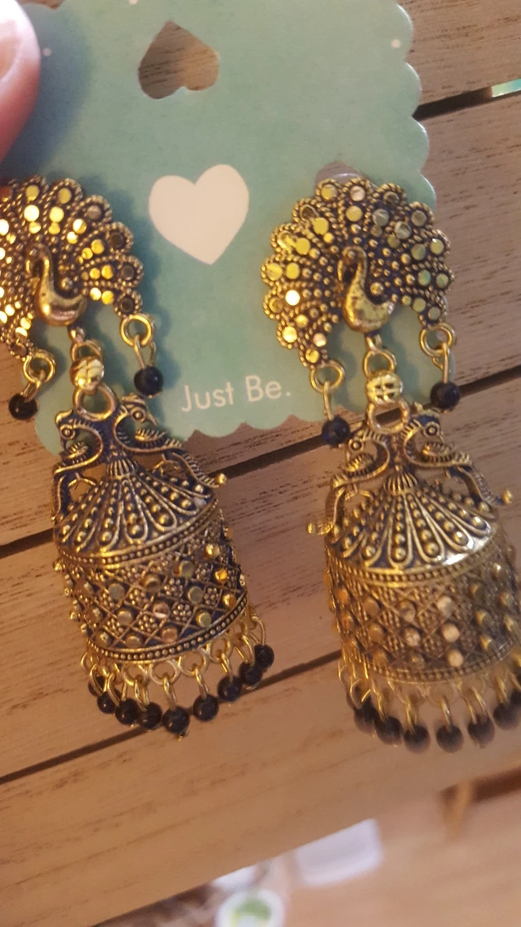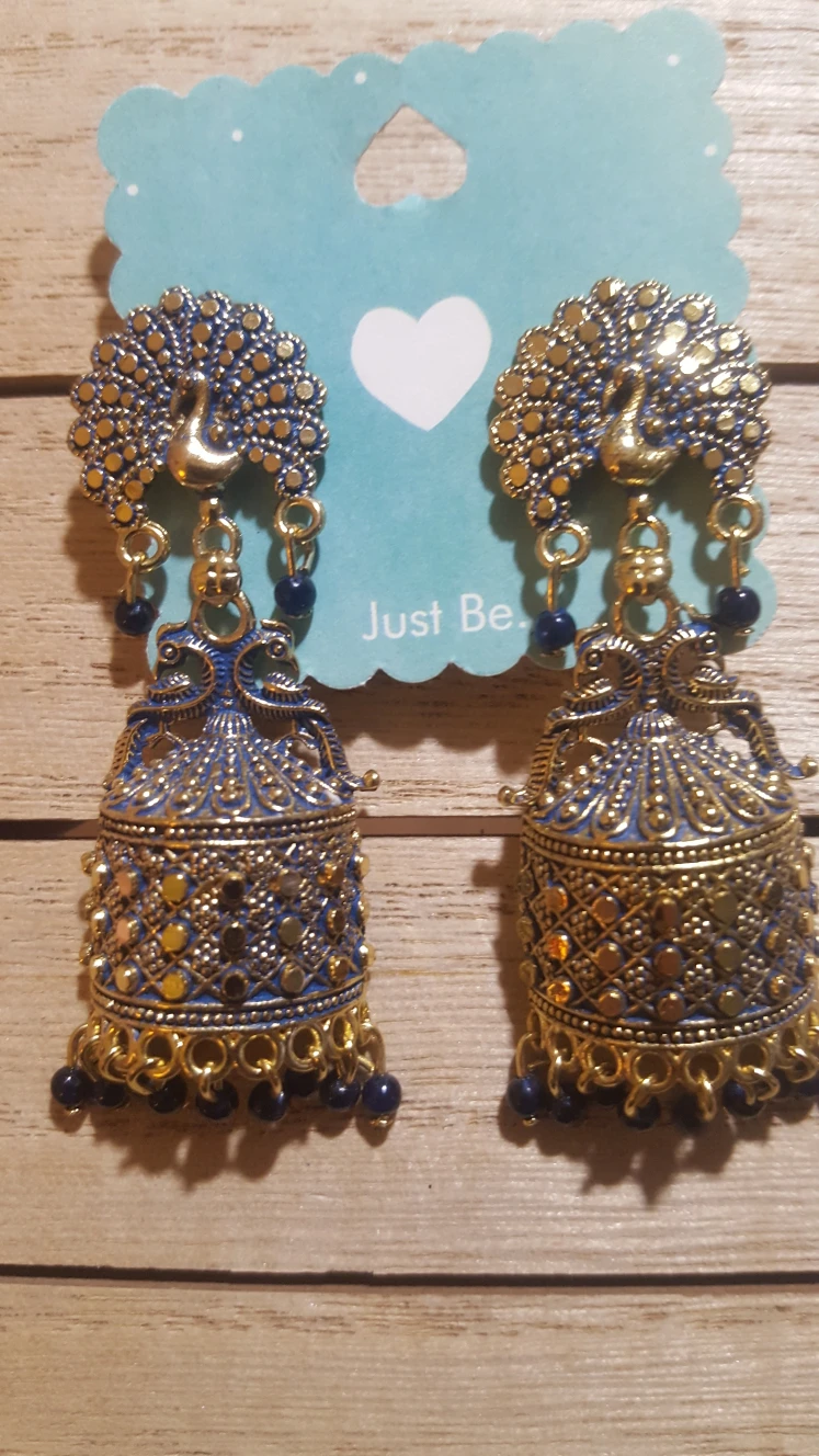 Very unique 2.4 inch drop pierced earrings on studs (with rubber back). Gold with an indigo undertone peacock design on a half bell with indigo coloured bead tassles. Little weight to the design. Purchased in a Bengaluru (Bangalore) market, new and never used. 🔥 Purchase 2 pairs of earrings for $15 - see other listings 😁 🏀 Go west side team!!