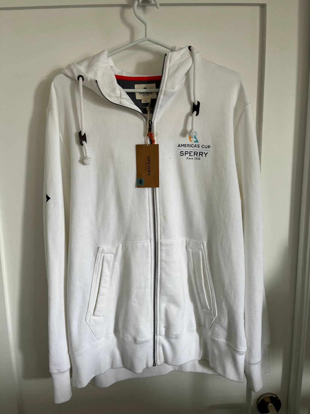 A white hoodie with a zipper. Features pockets on the front. The hoodie is an XL size and still has the original tags. You'll find this item is perfect for cozy nights at home.