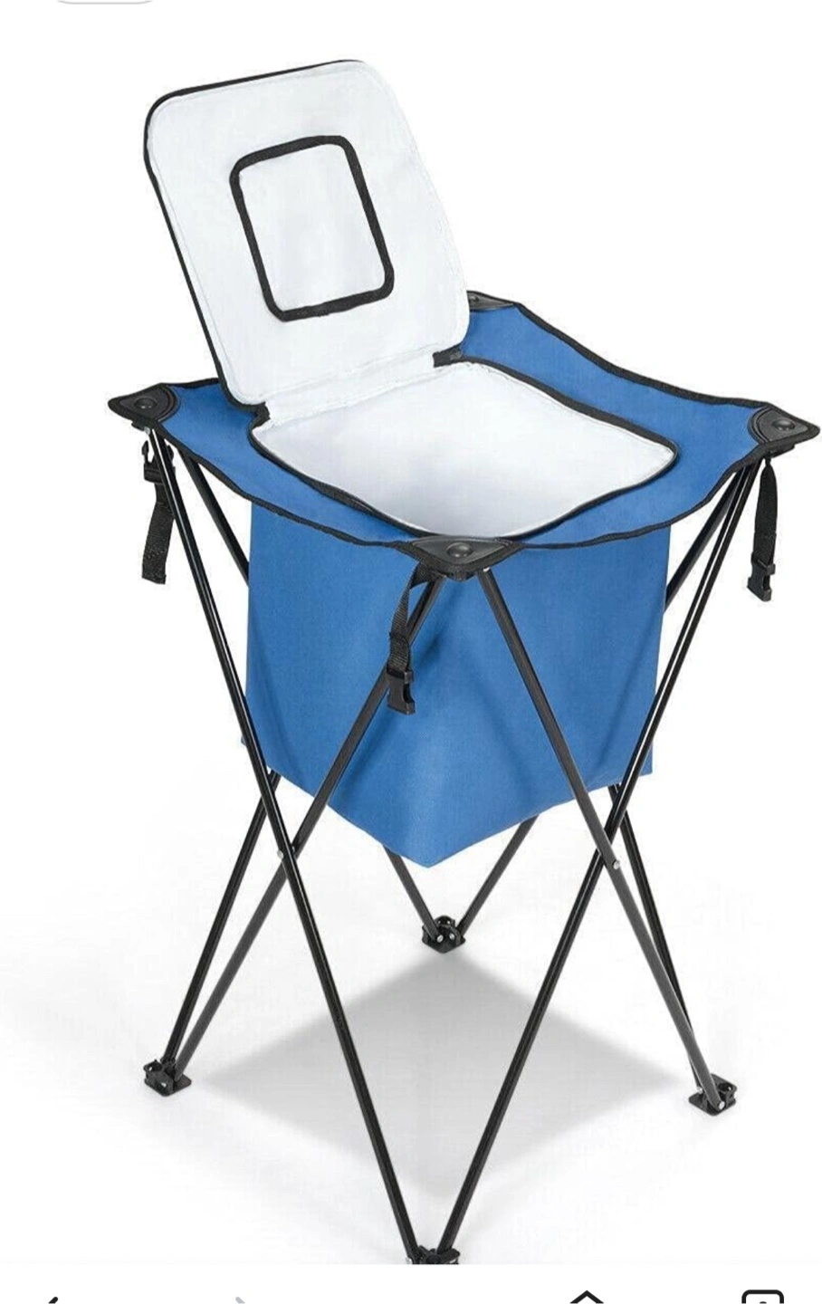 A red and black portable chair. Features a cooler. A great item for your outdoor activities or relaxation.