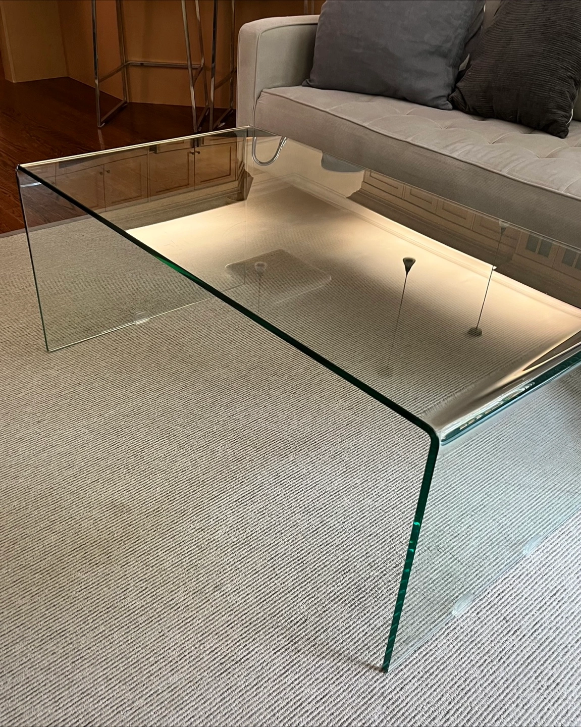 A sleek, rectangular glass waterfall coffee table from Structube. Features soft curved corners.