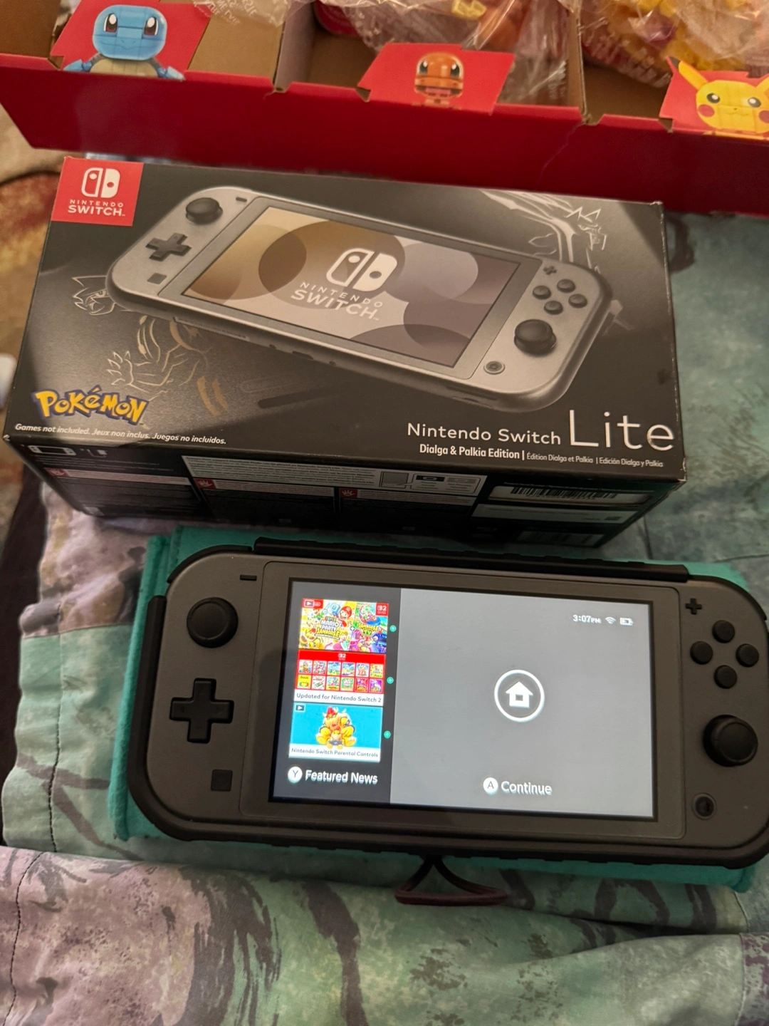 The console is grey. The screen shows icons. The box is black. The box features the Nintendo Switch logo. You can use this console to get lost in your favourite games.