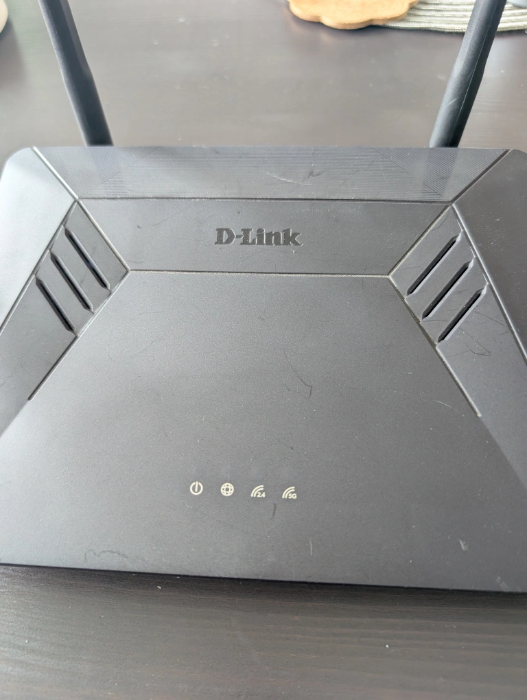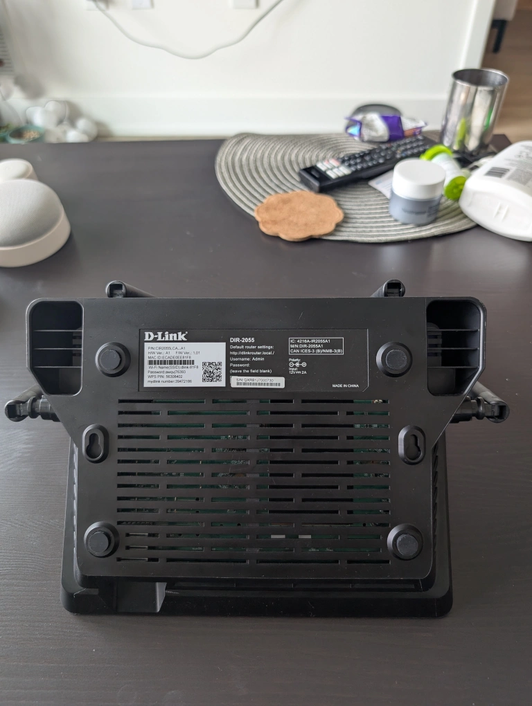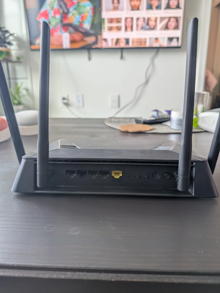 A router with multiple antennas. Ports at the back. Bottom with vents and rubber feet. The perfect device to set up your home network to stay connected.