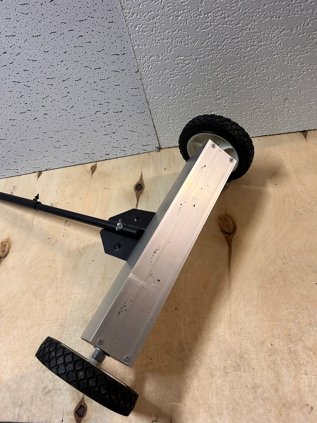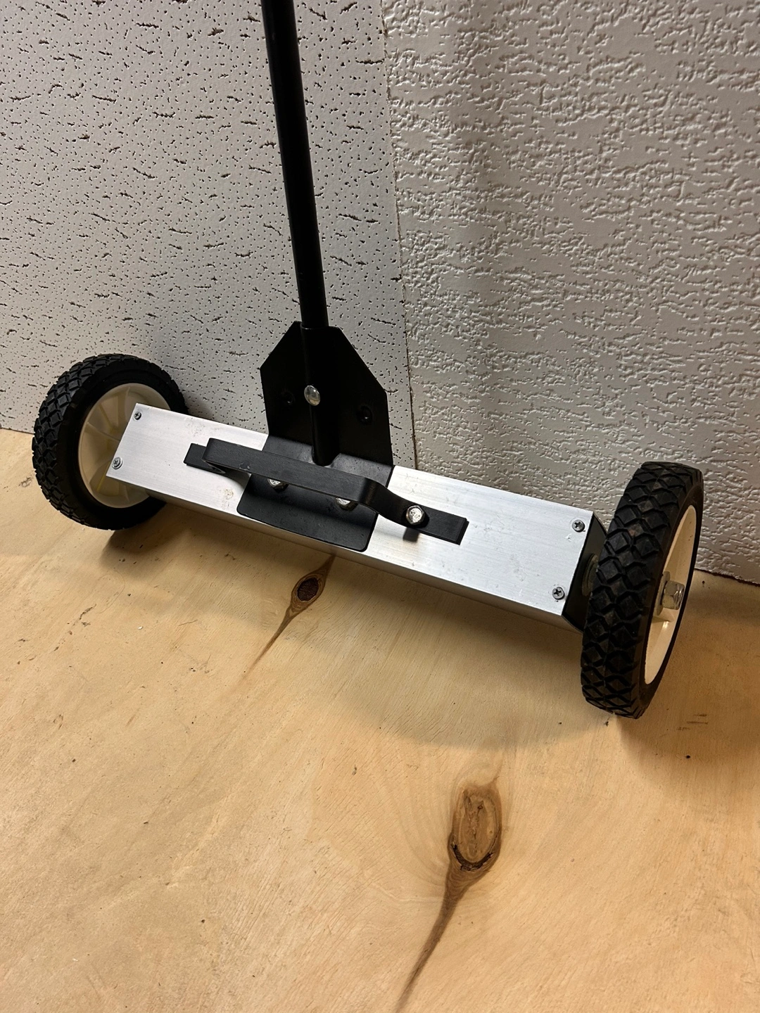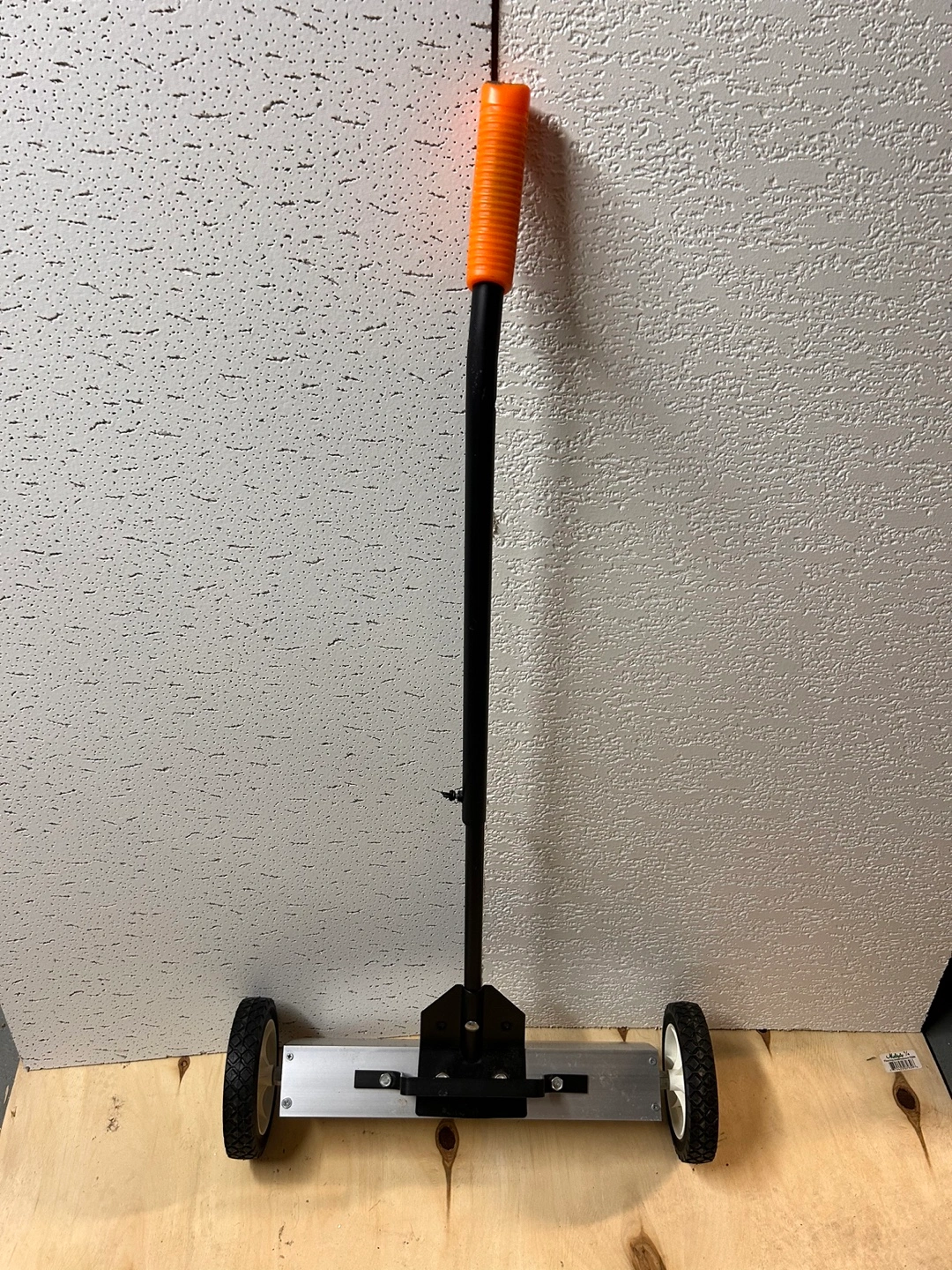 I am selling a magnetic sweeper. It has a rectangular magnetic bar. Includes two wheels on each side. The handle features an orange grip. Perfect for collecting any metal scraps, leaving you with a sense of accomplishment.