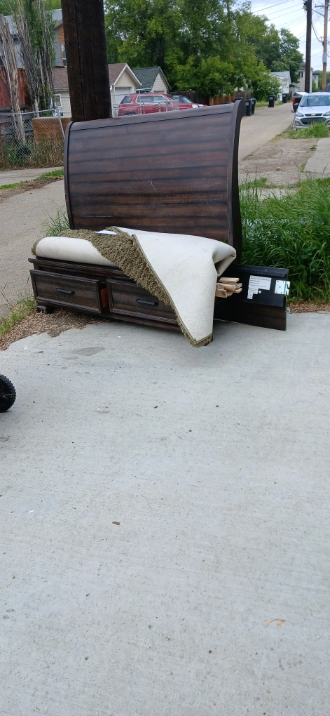 A free dark wooden bedroom set. Includes a headboard, storage unit, and a rug. These pieces would be perfect for a bedroom refresh, providing you with a calm and cozy atmosphere.