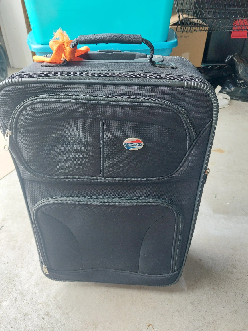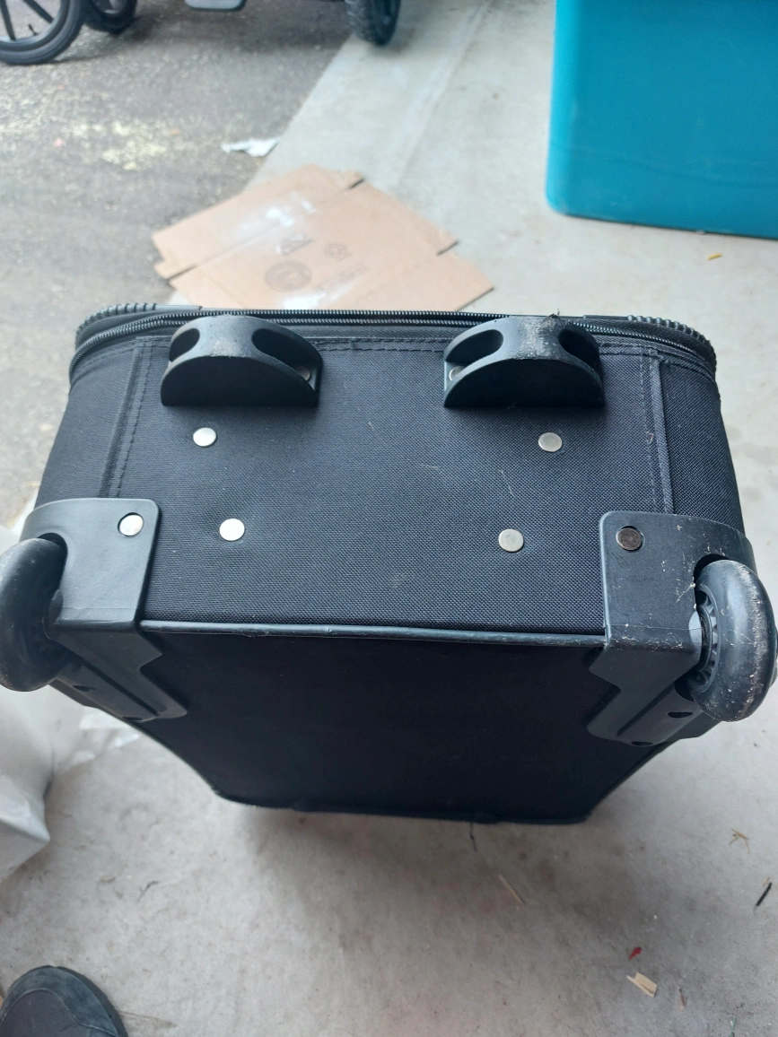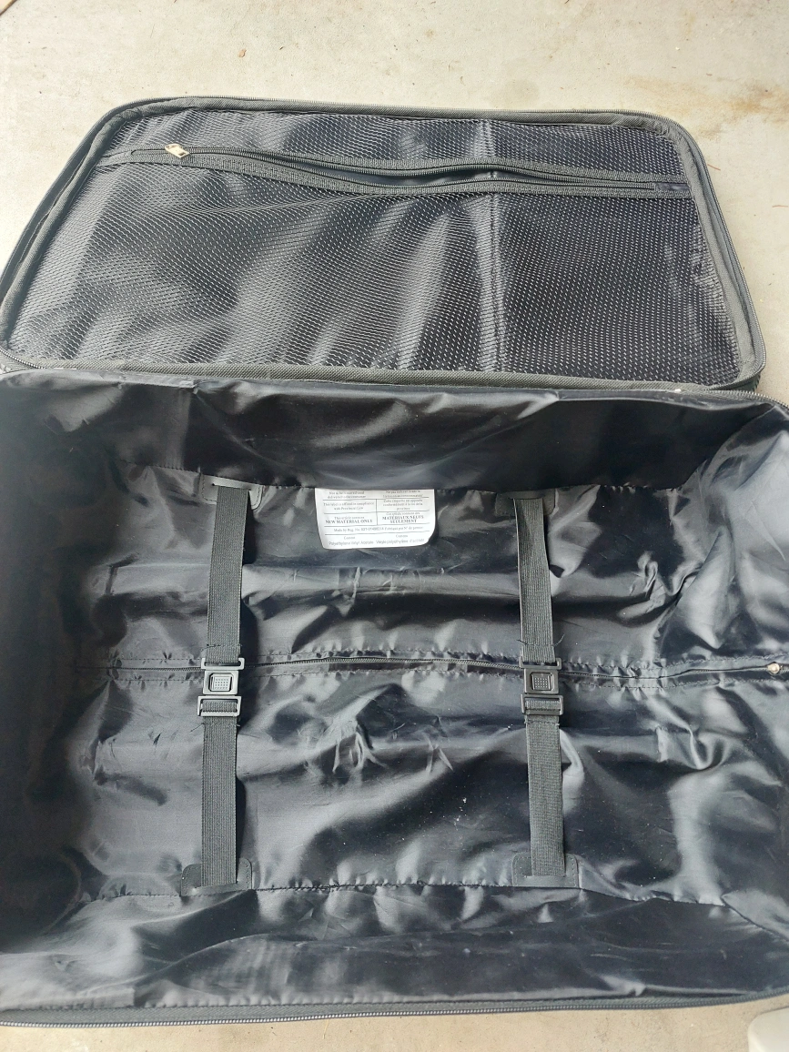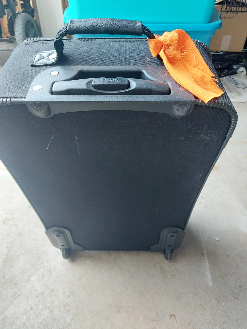 Black rolling suitcase. Carry on Luggage. up to 25 lbs Features a zippered closure and a top handle for easy carrying. Interior has straps to hold items in place. This suitcase would be perfect to take on your next getaway.