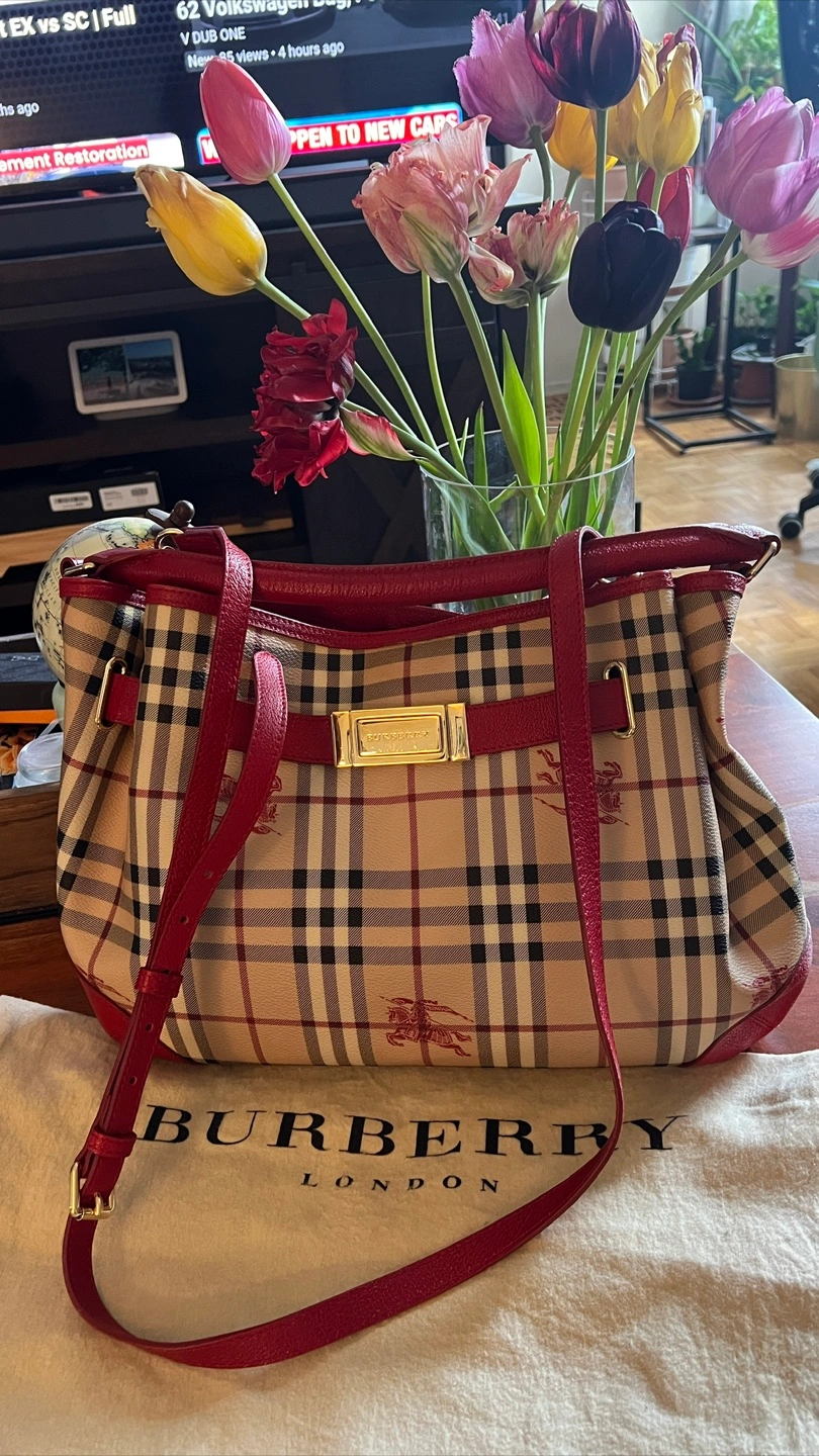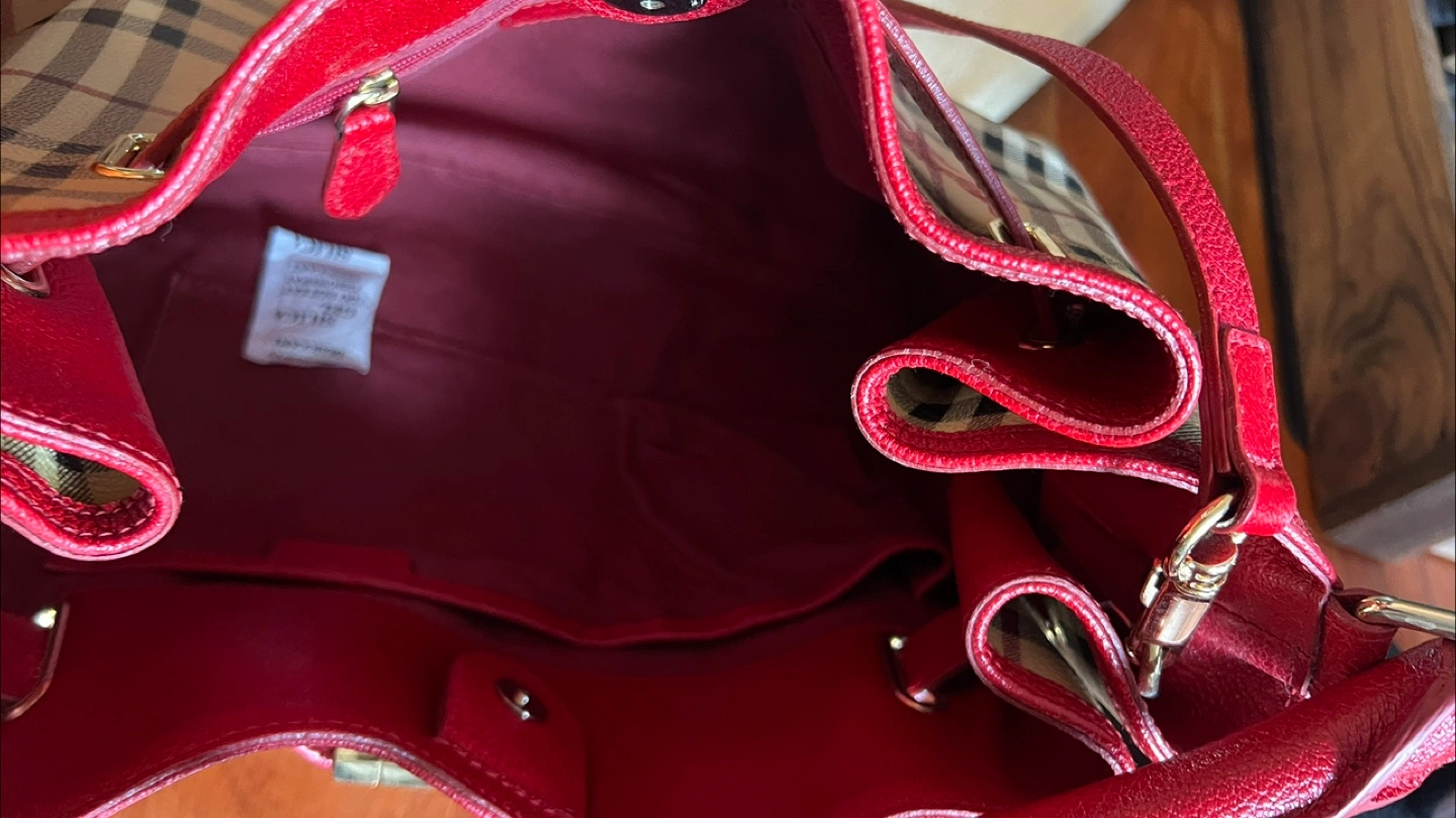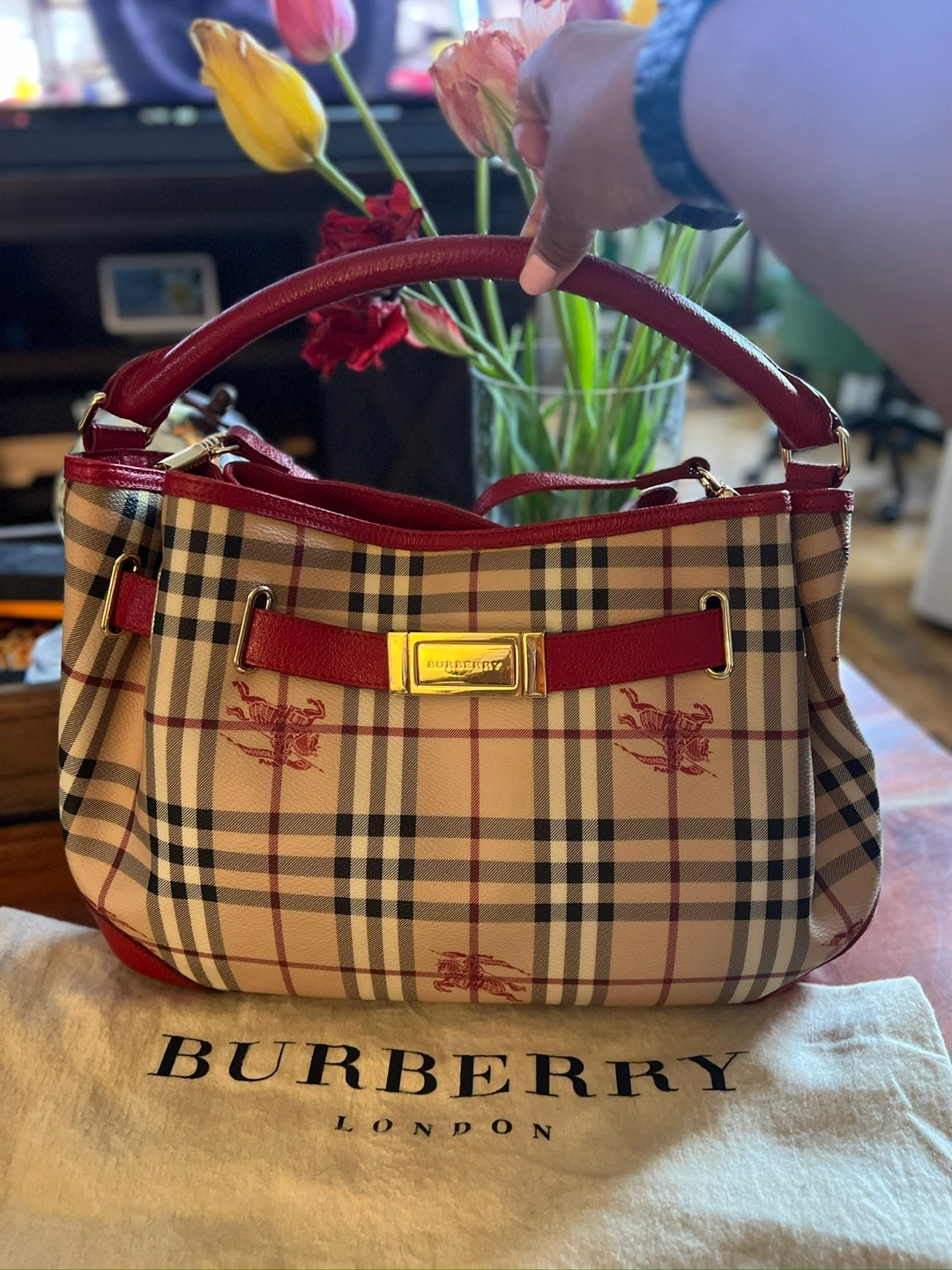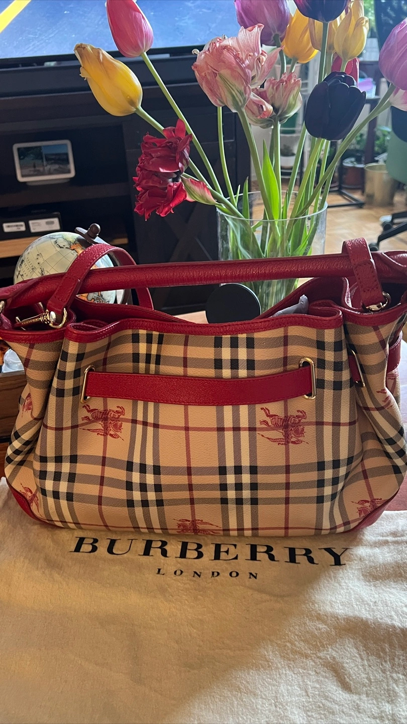 A preloved authentic Burberry handbag with red leather accents. The bag has a plaid pattern. Included is a dust bag.