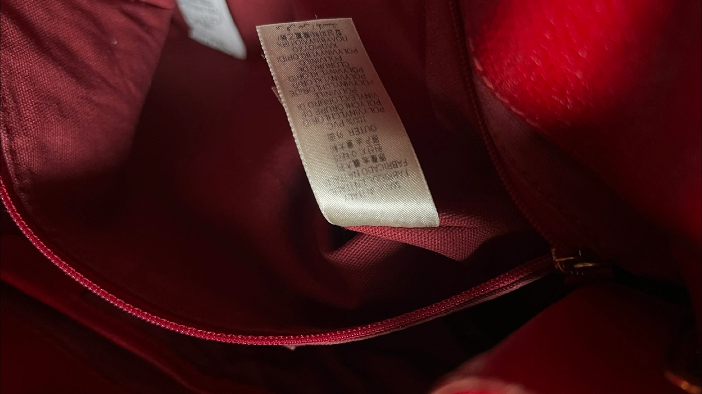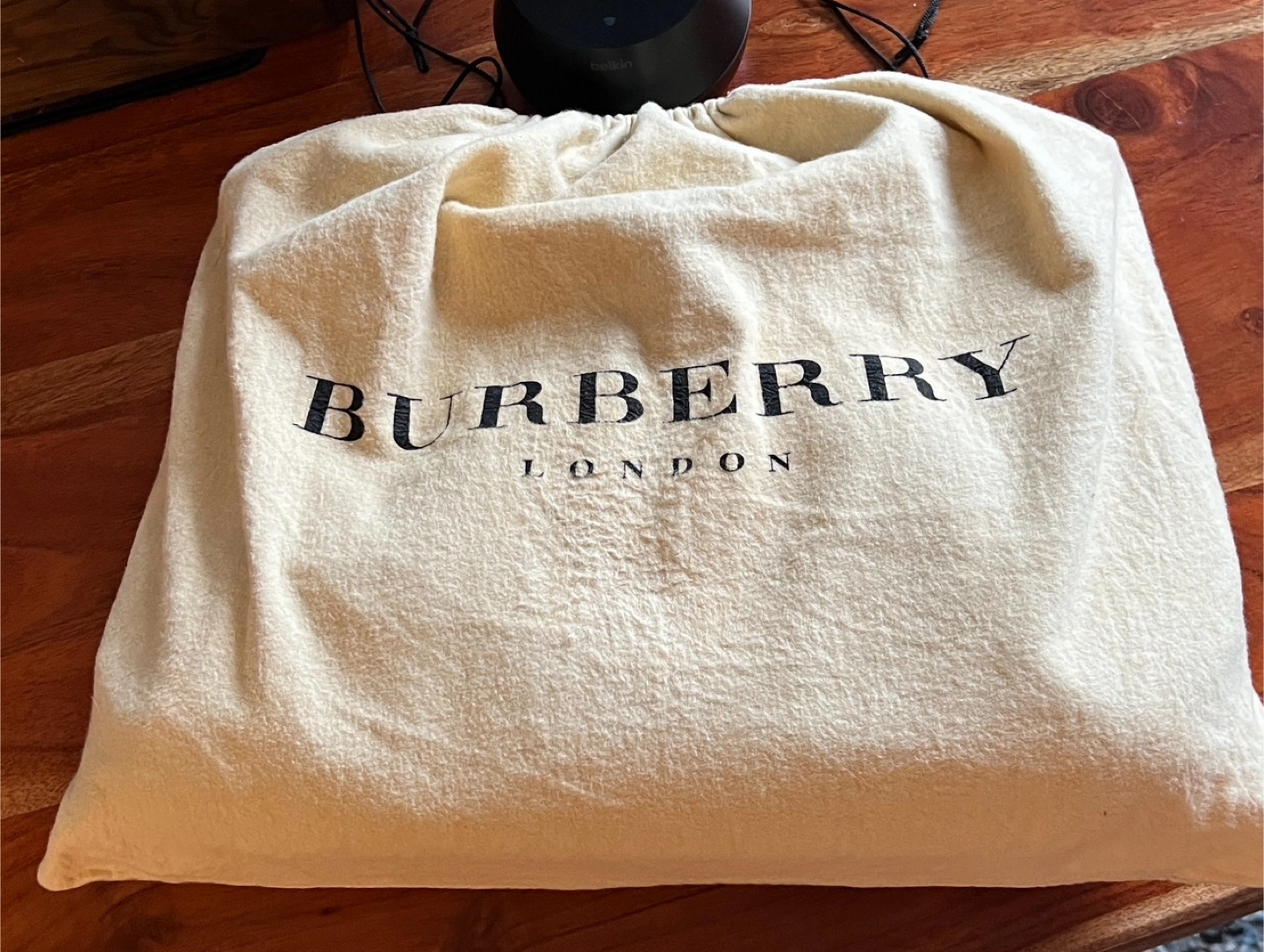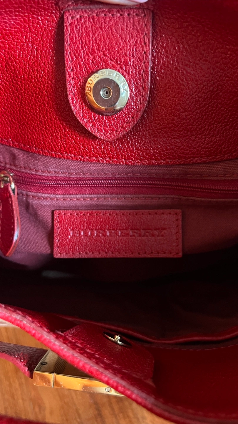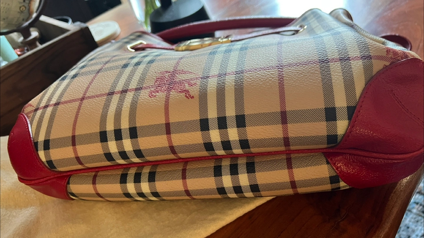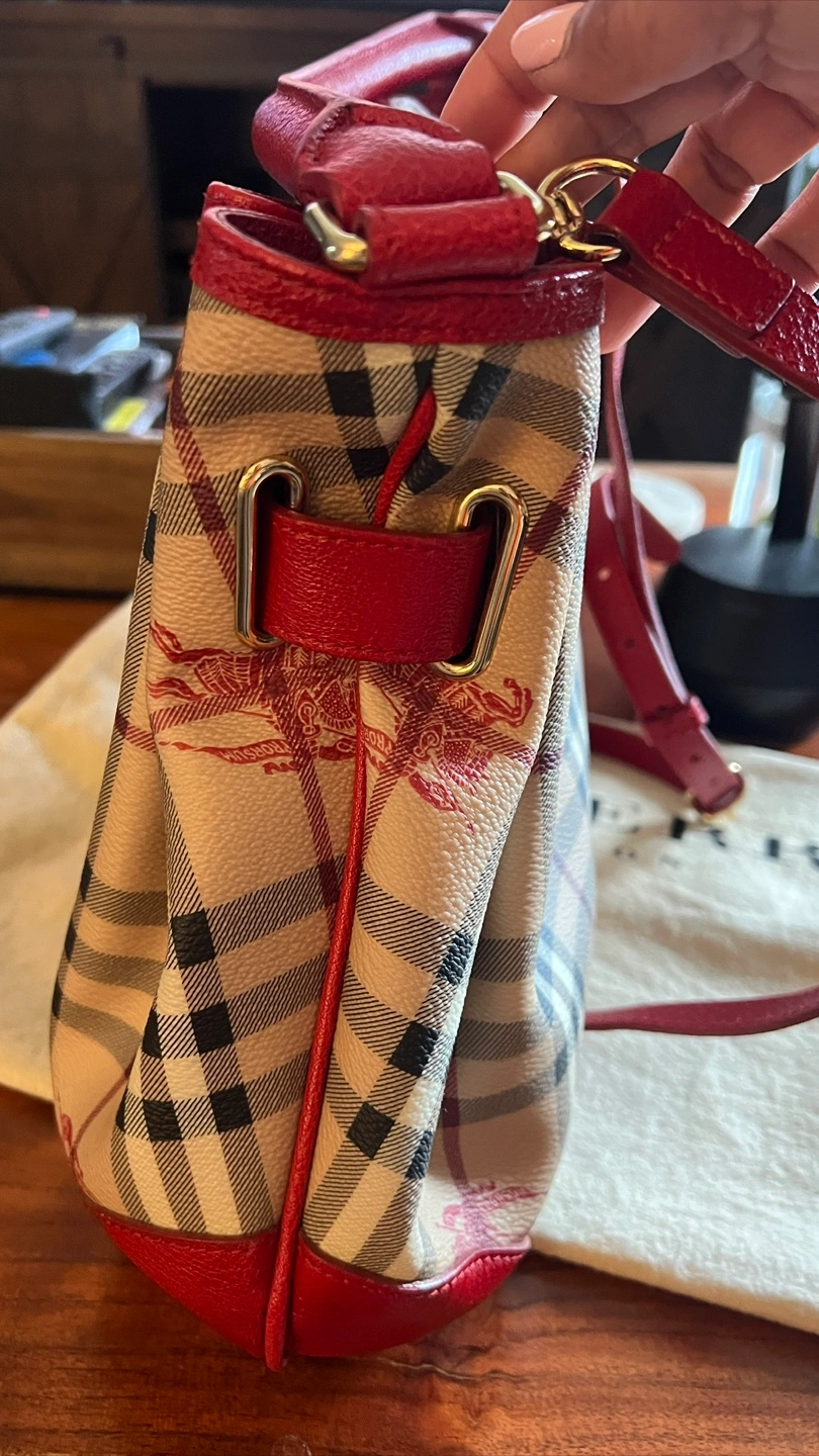 A preloved authentic Burberry handbag with red leather accents. The bag has a plaid pattern. Included is a dust bag.