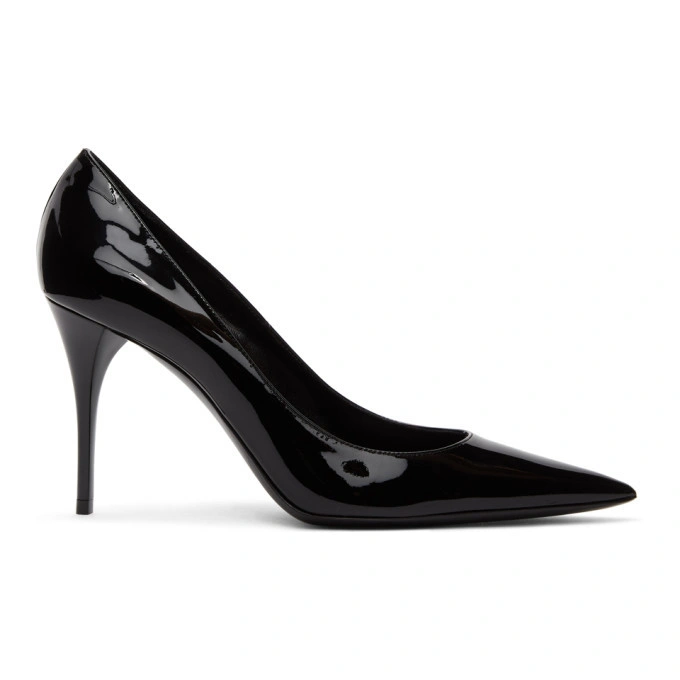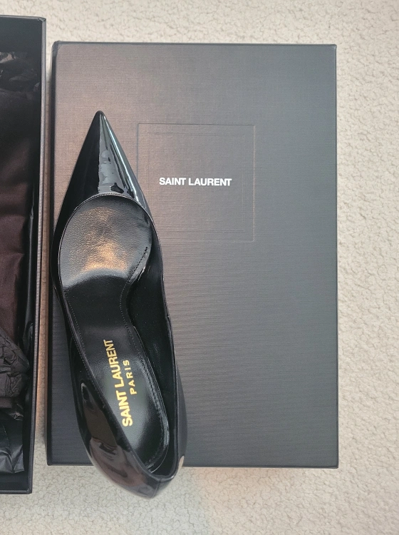 Absolutely brand new Saint Laurent black patent leather heels in size 35. In perfect condition all around (see close up and photos on the bottom of sole).
