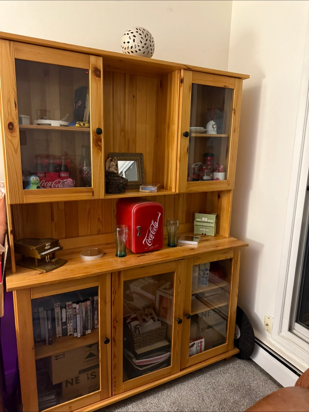 A wooden cabinet with glass doors and shelves. It has a classic design. A great way to organize your belongings and give them a safe and beautiful home.