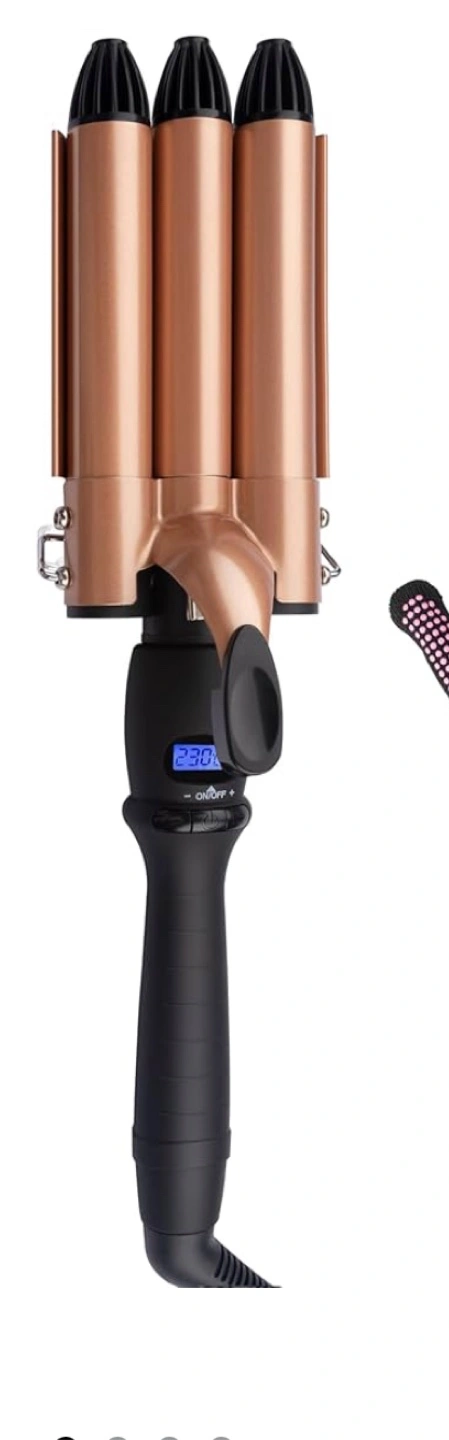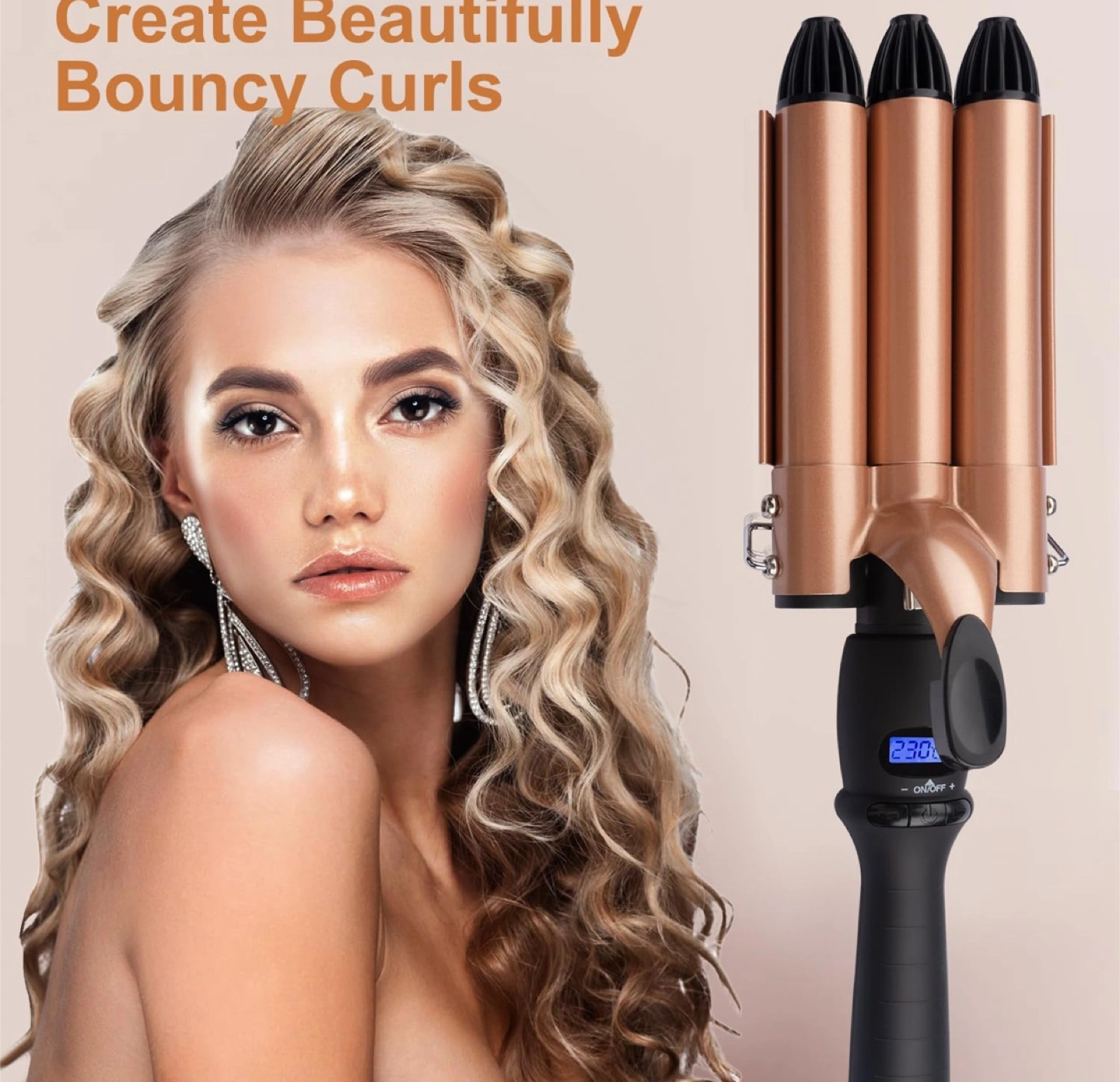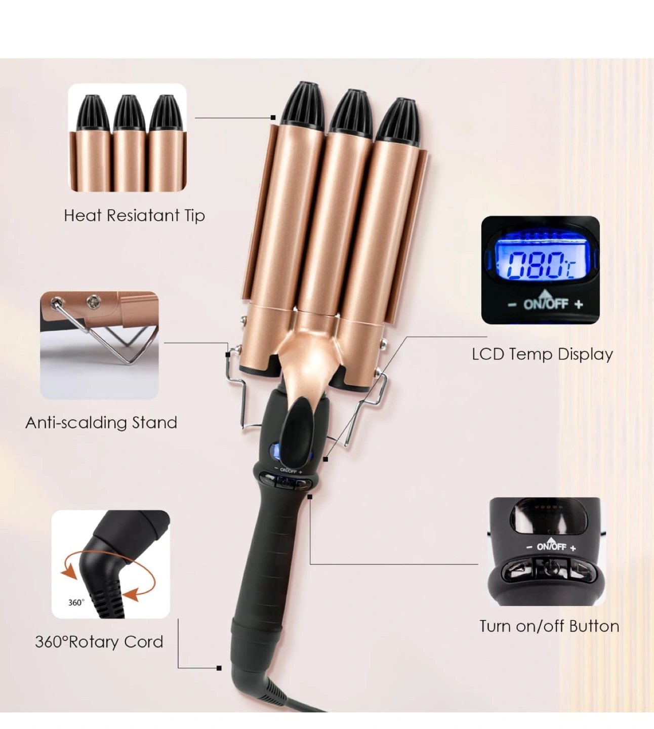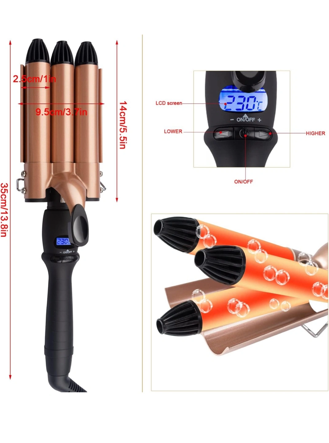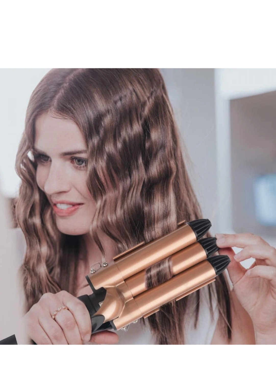 Rose gold coloured hair waver. Three barrel design. Features an LCD screen. Perfect for creating beach waves for a more relaxing time.