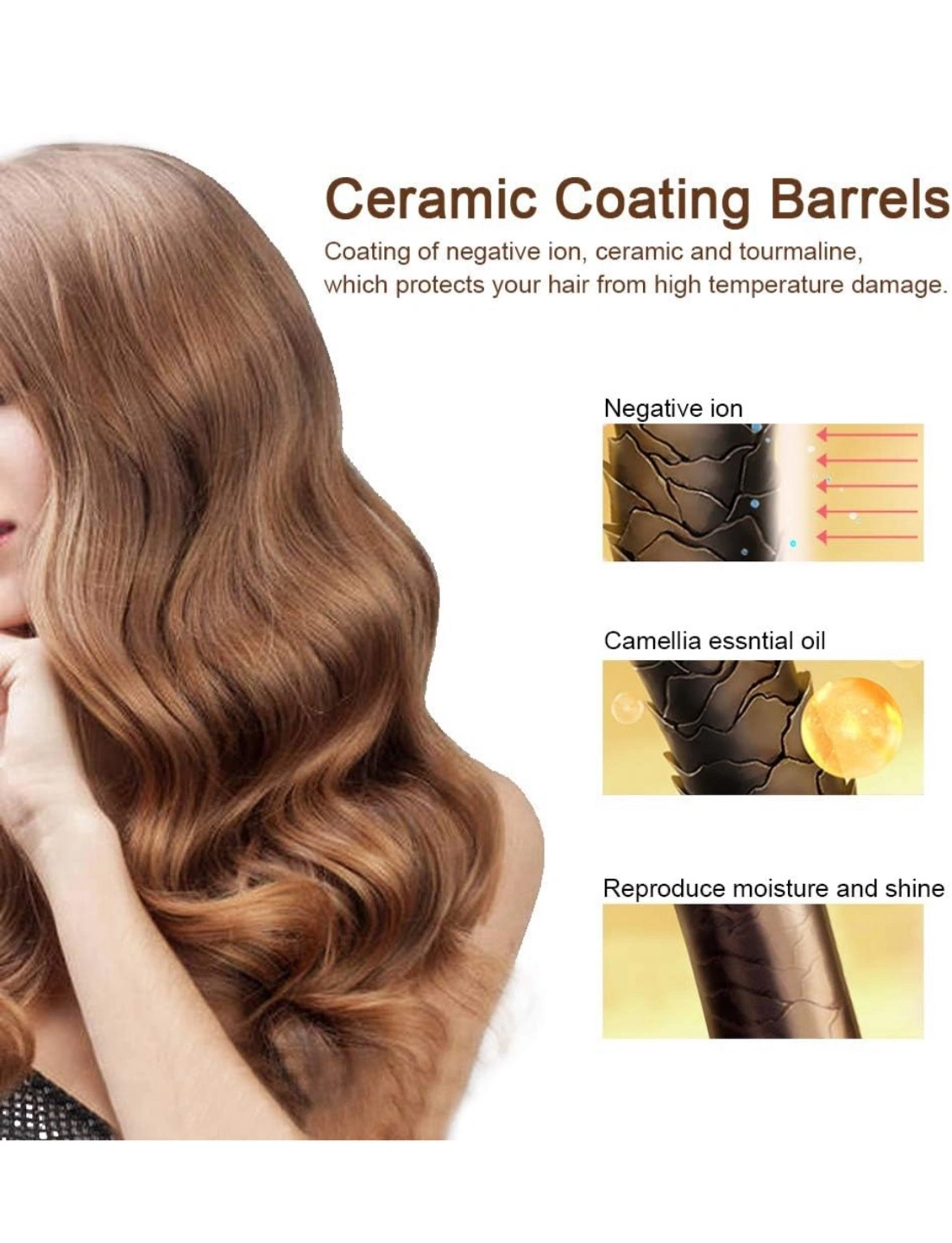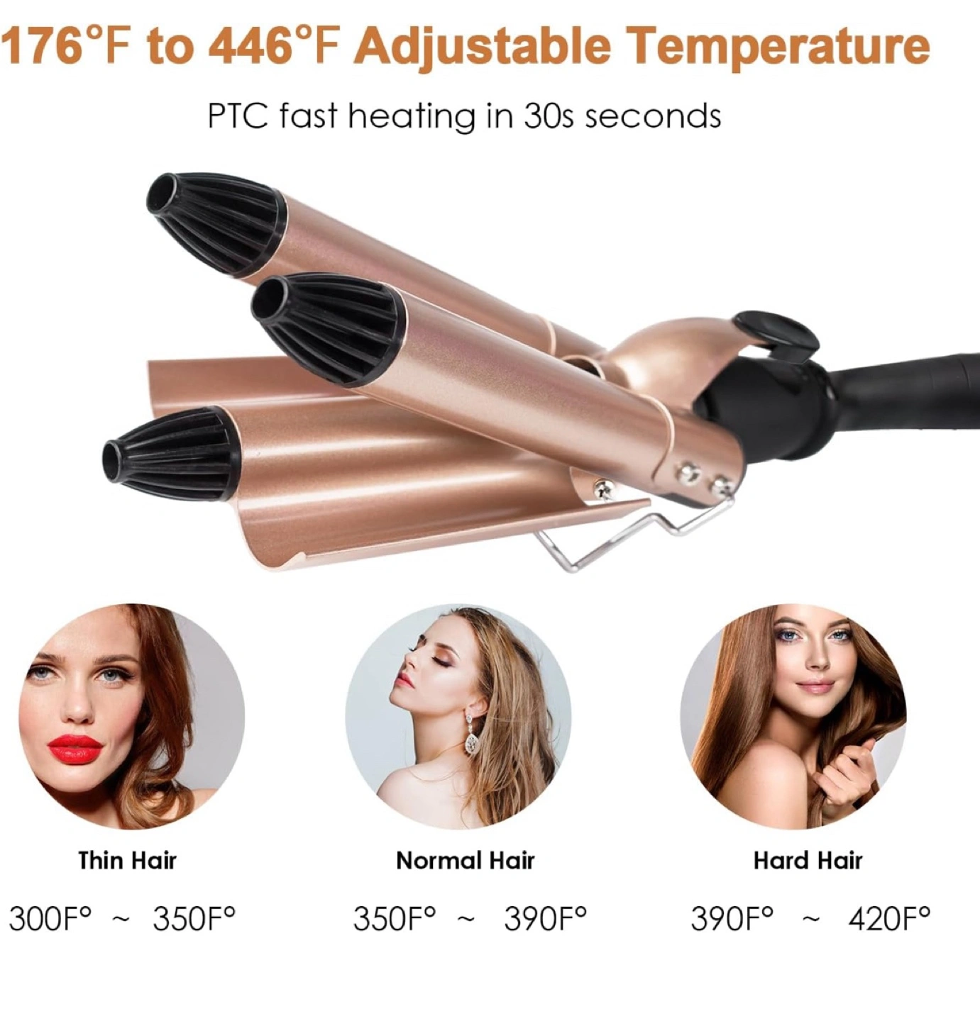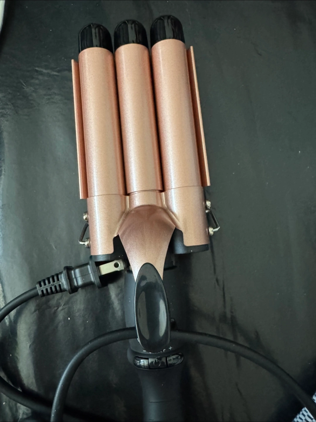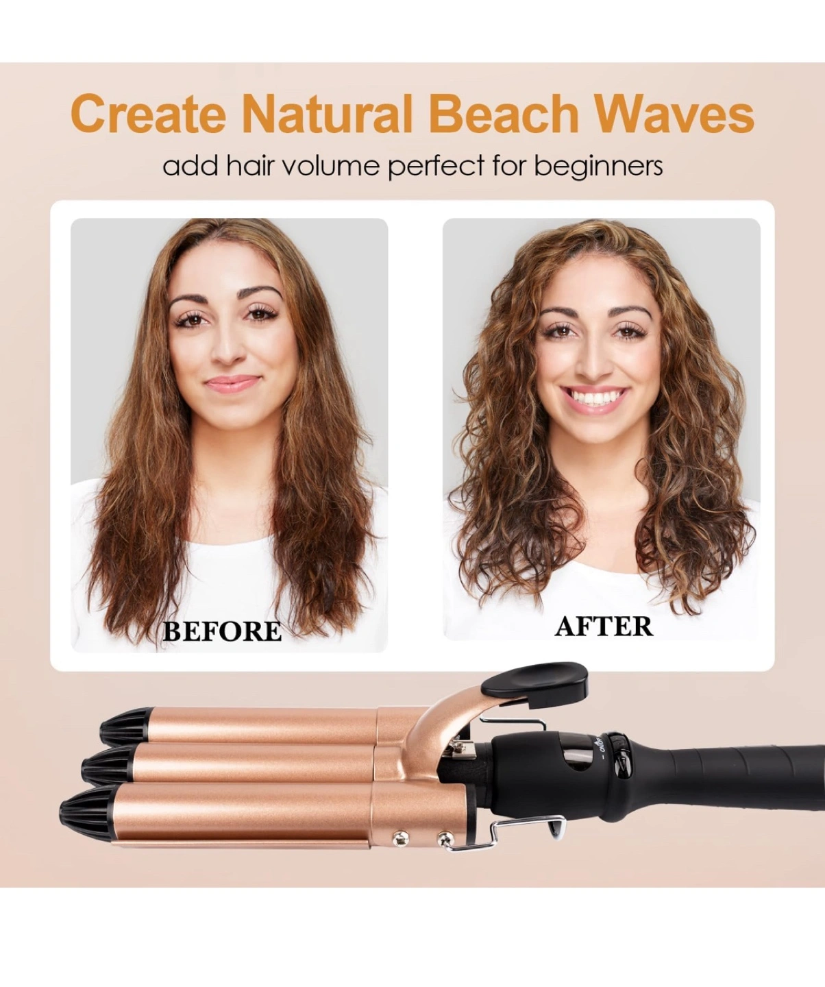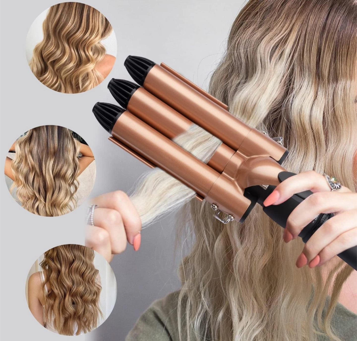 Rose gold coloured hair waver. Three barrel design. Features an LCD screen. Perfect for creating beach waves for a more relaxing time.