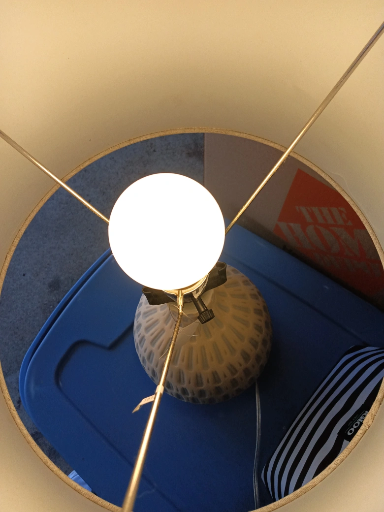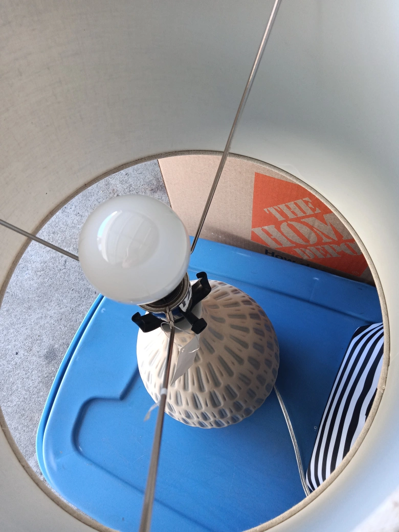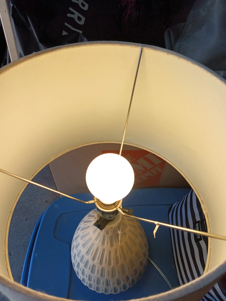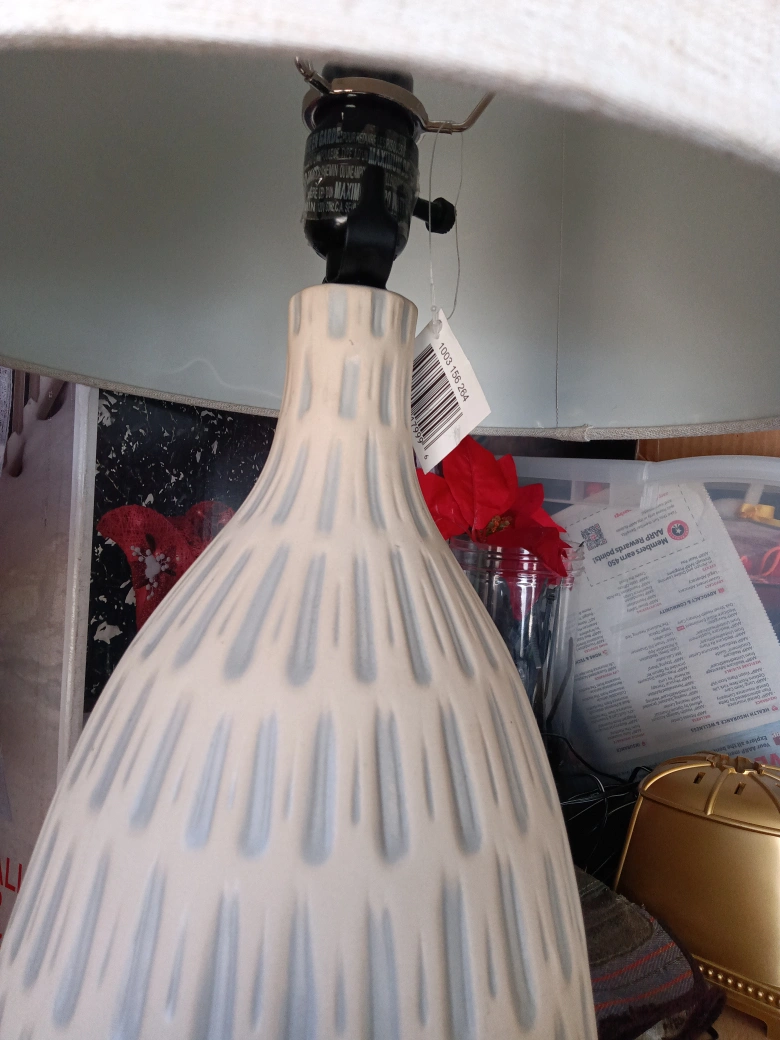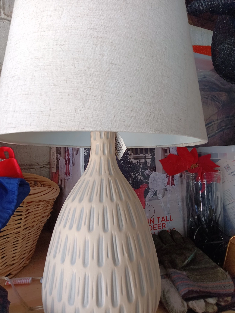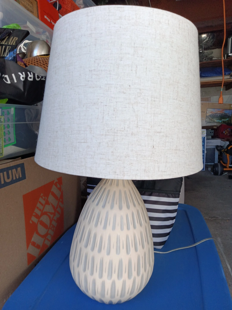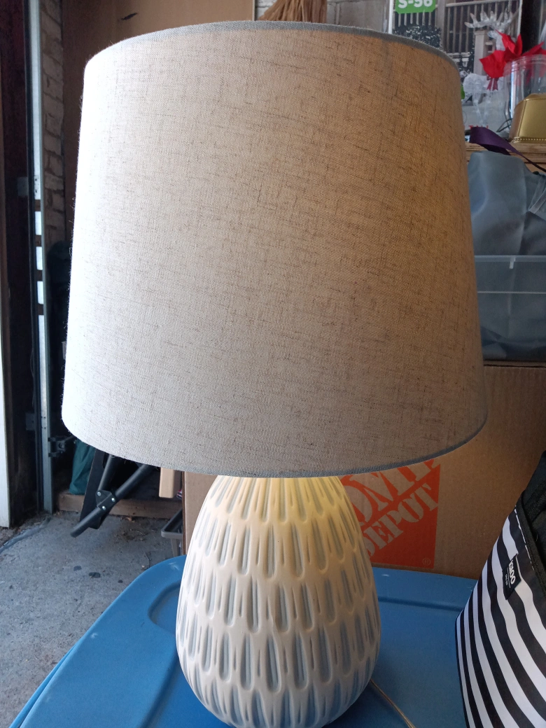 A new stylish table lamp. Features a neutral-toned, textured base. Light blue & a creamy white tone. The lamp has a white linen shade. Pickup in Maspeth Queens, blks from LIE.