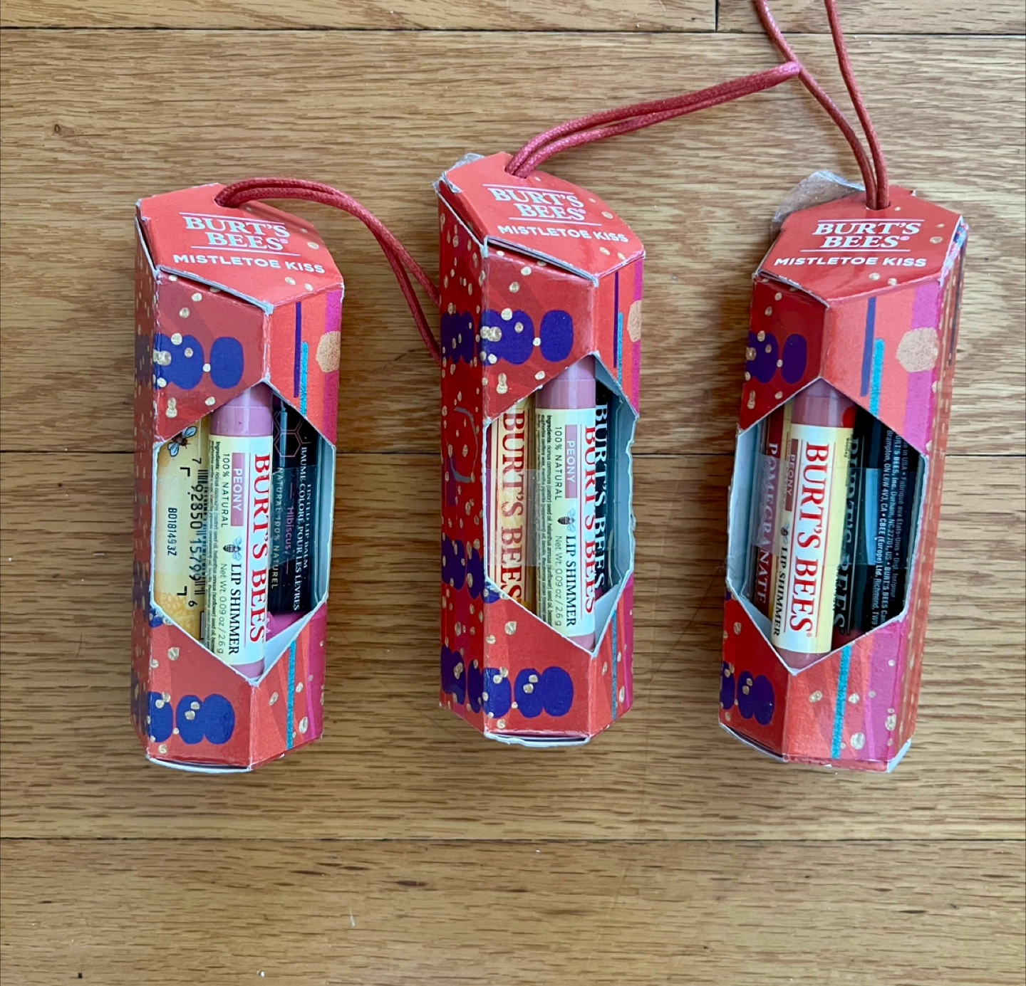 3 lip shimmers and tinted lip balms, all packaged neatly in boxes.