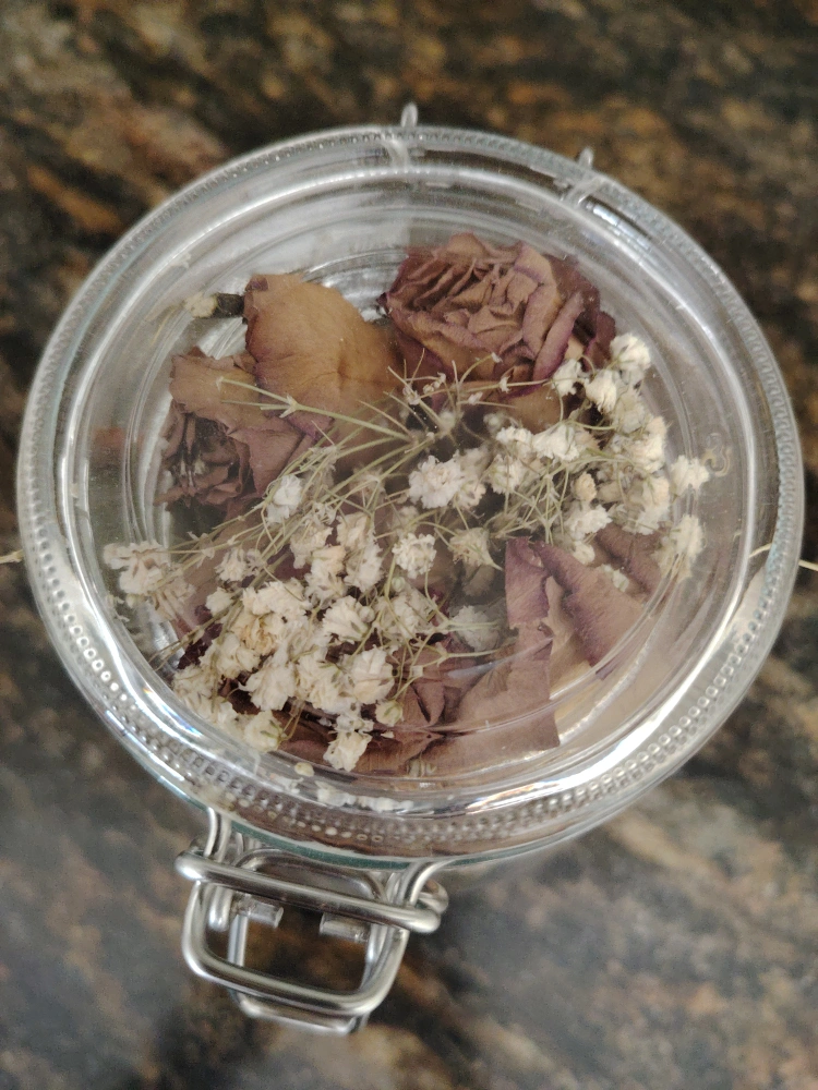 A clear glass jar with a metal clasp. It holds dried flowers, some roses among them. The jar is filled with the flowers. The glass jar is perfect for a relaxing activity, such as meditation