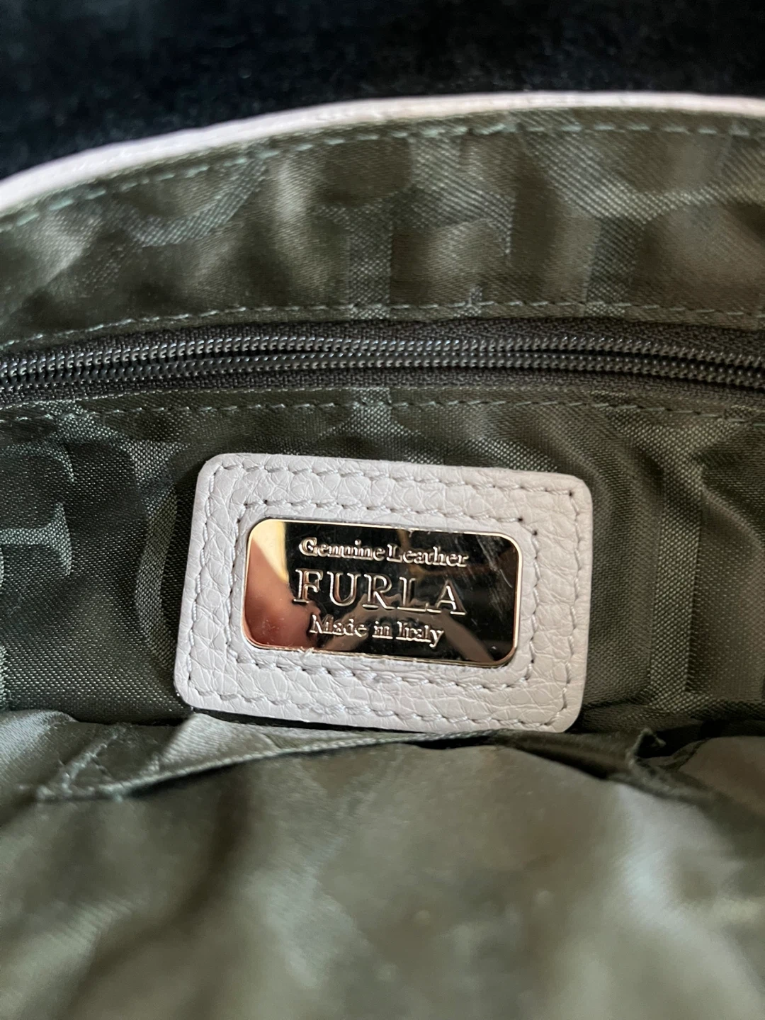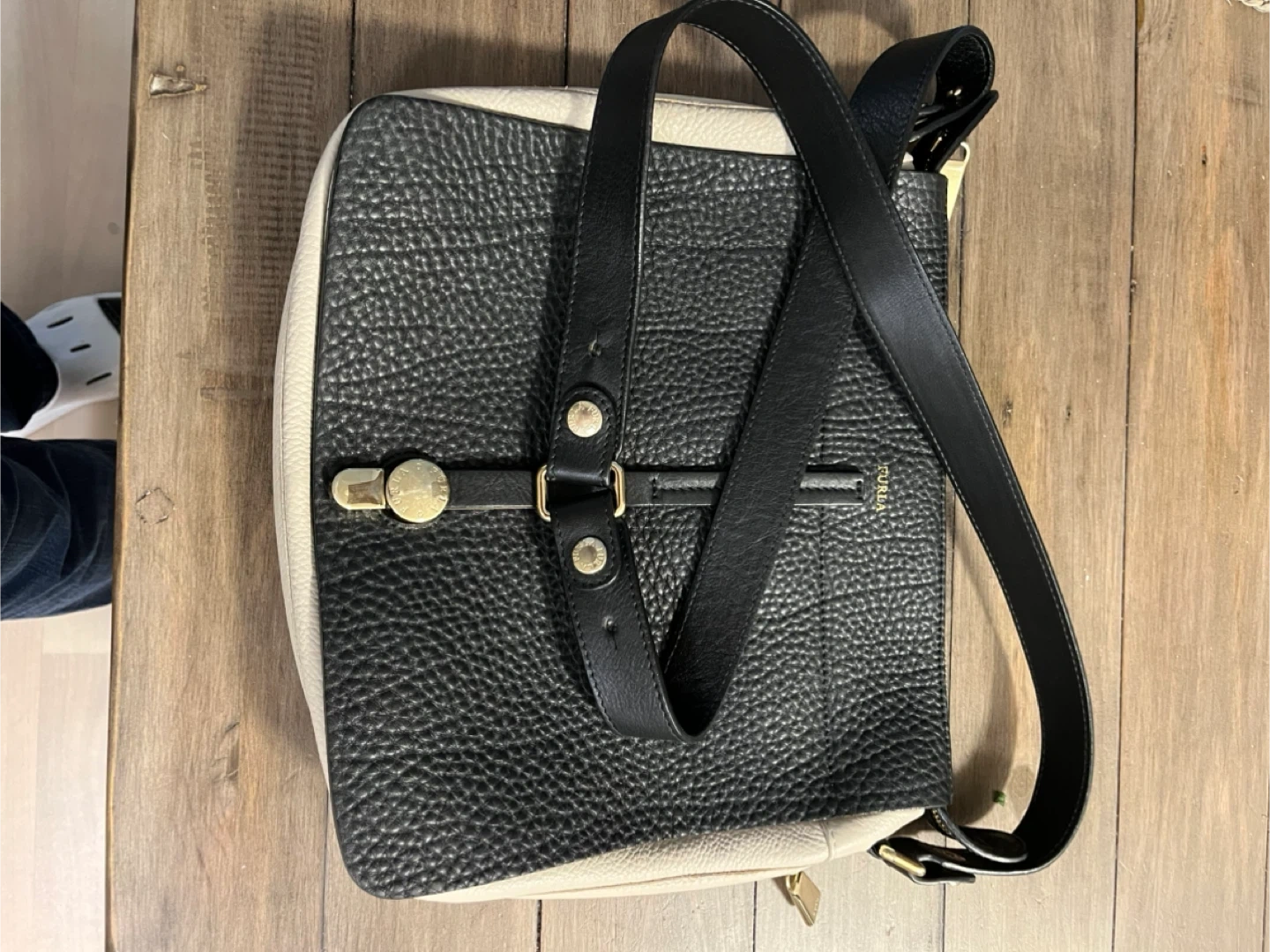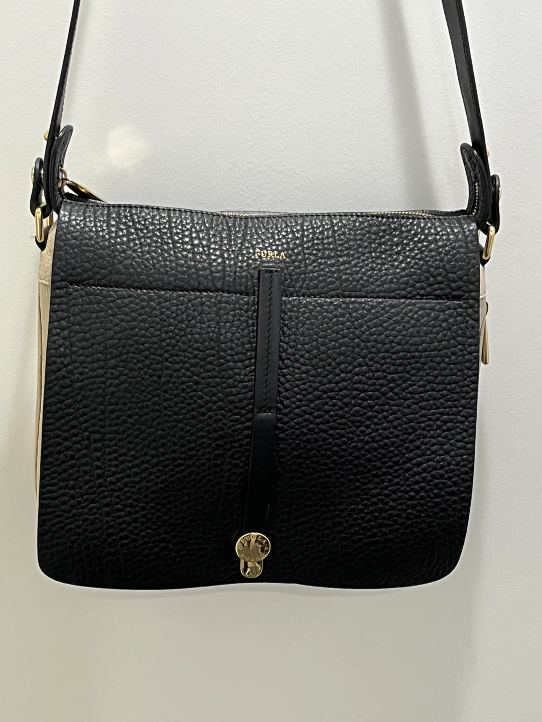 Genuine Furla expandable X-Body bag in mint condition. Black Pebbled leather with Cream Leather