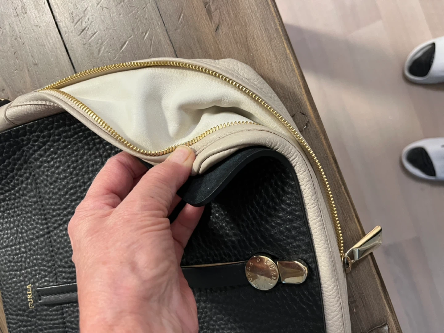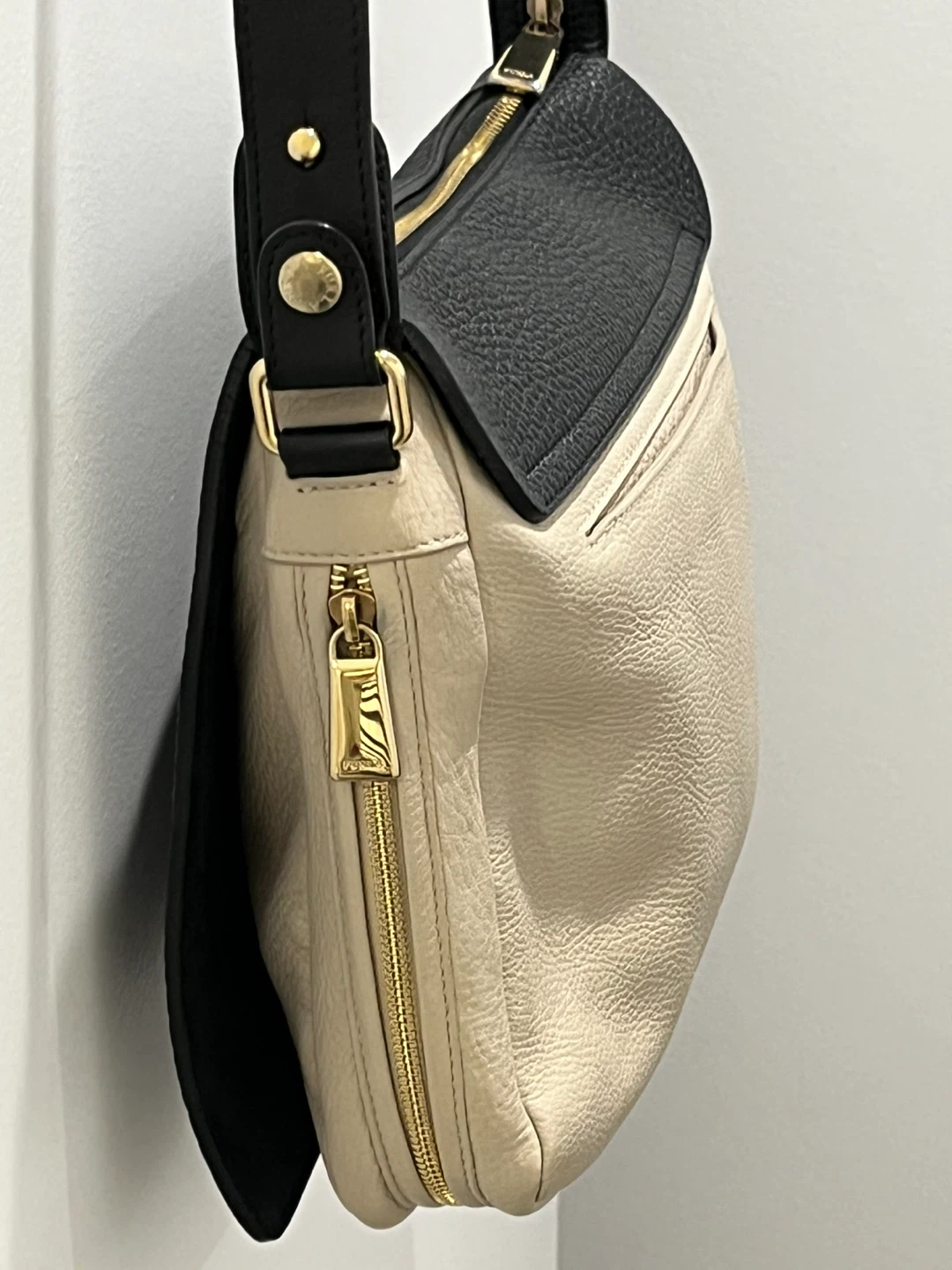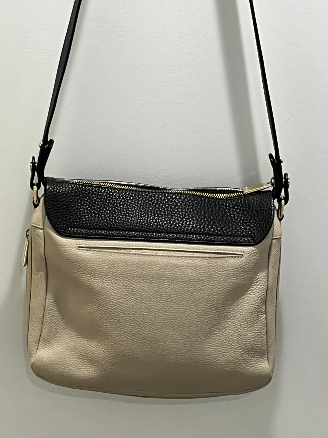Genuine Furla expandable X-Body bag in mint condition. Black Pebbled leather with Cream Leather