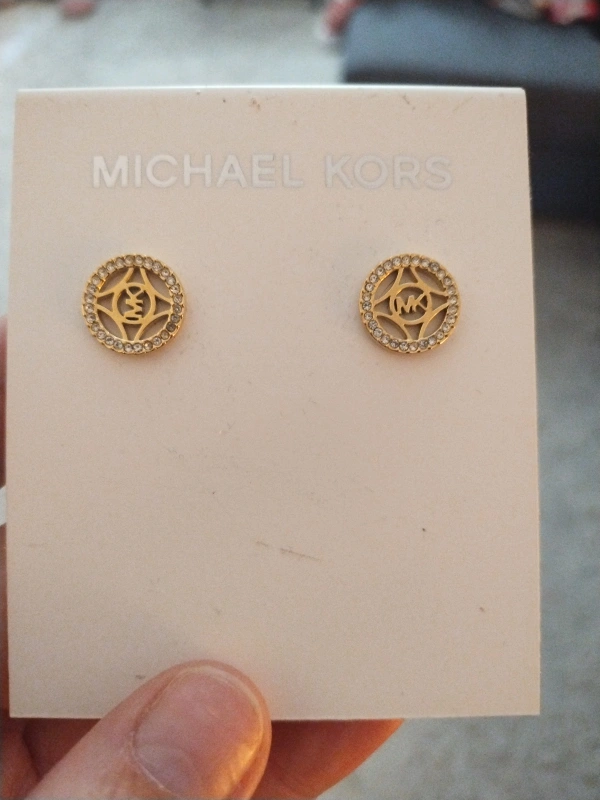 85Pair of stud earrings. Features a gold-tone finish. Each earring has the brand's logo with surrounding rhinestones. Consider them a soothing addition to your everyday look.