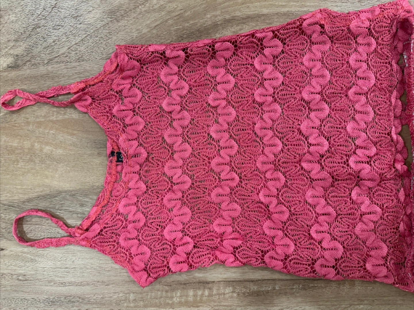 Delightful crochet pink lace set. Features a top with thin straps. Skirt has a ruffled edge.
