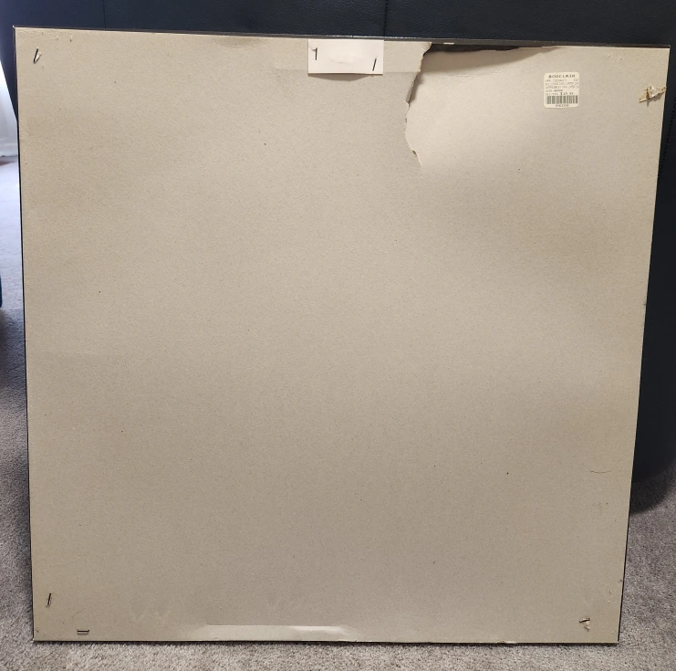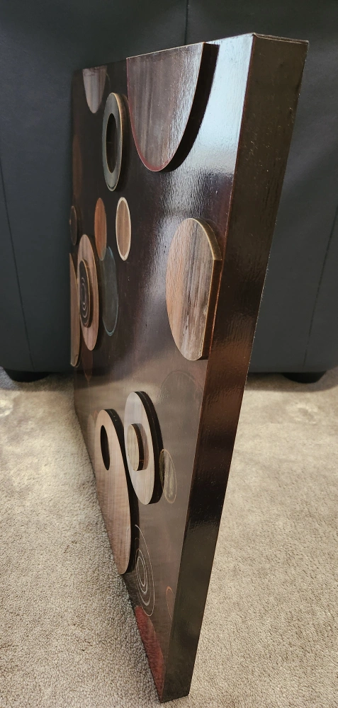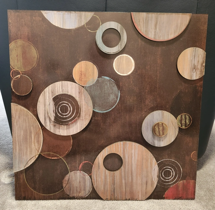Wall art featuring a dark background with layered, textured circles. Different sizes and colours are scattered throughout. Makes a nice focal point for your home space.
