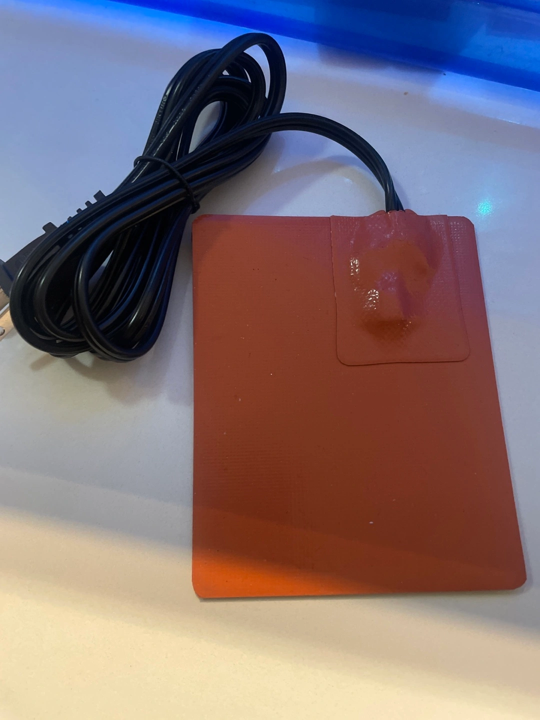 Orange engine heating pad. Features a black cord with a plug. Rectangular shape. Keep your engine warm throughout winter or when you go on icy vacations.