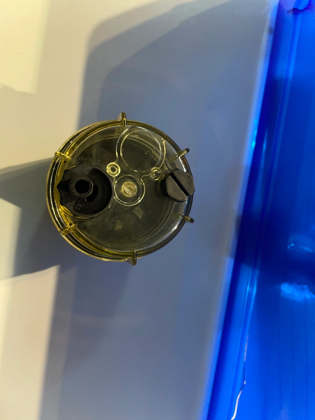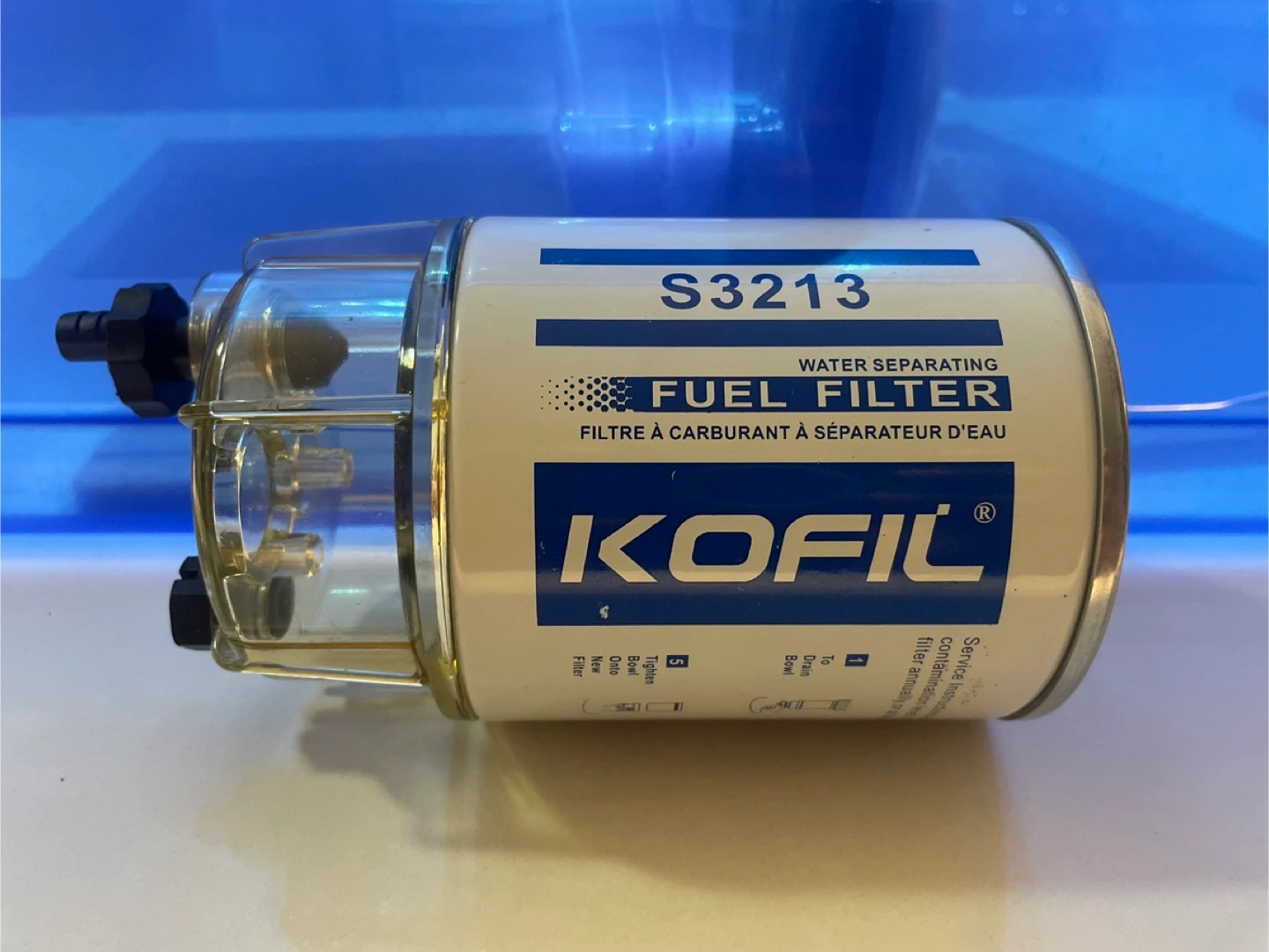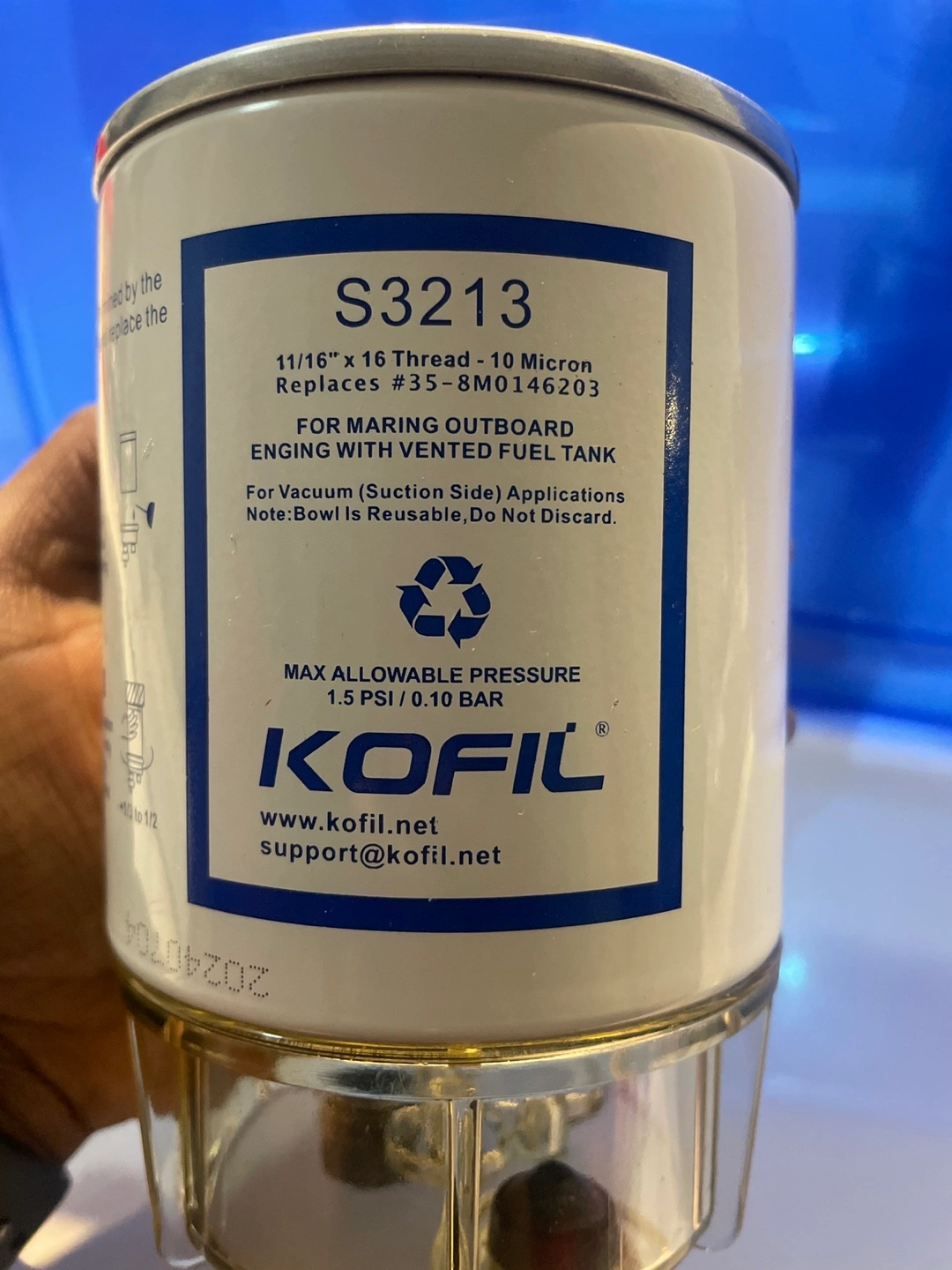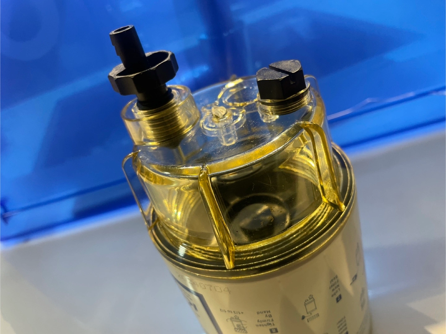 A fuel filter. Made with a clear plastic container. Displays the brand name and model number. Perfect for keeping your equipment running smoothly.