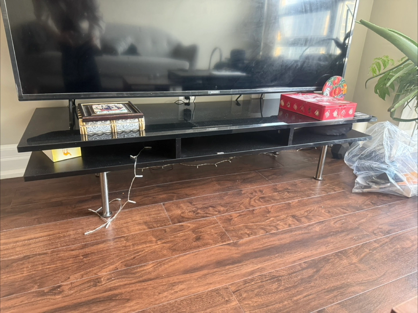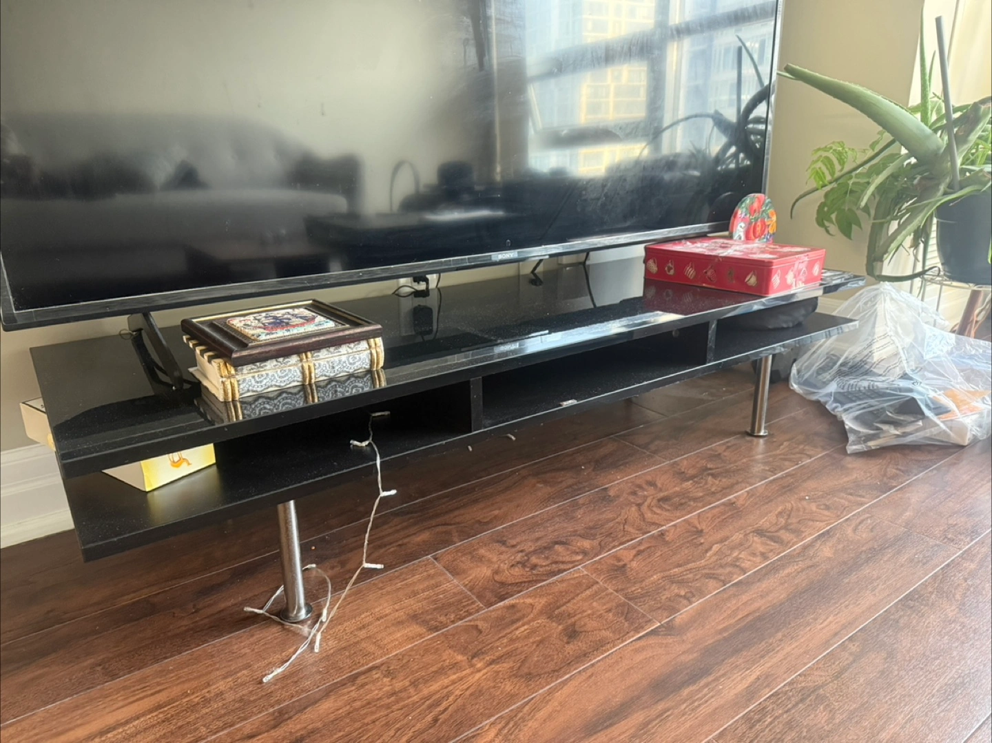 A black TV stand. Features multiple shelves and compartments for storage. Stands on metal legs. The tv in the picture is 65” inches.