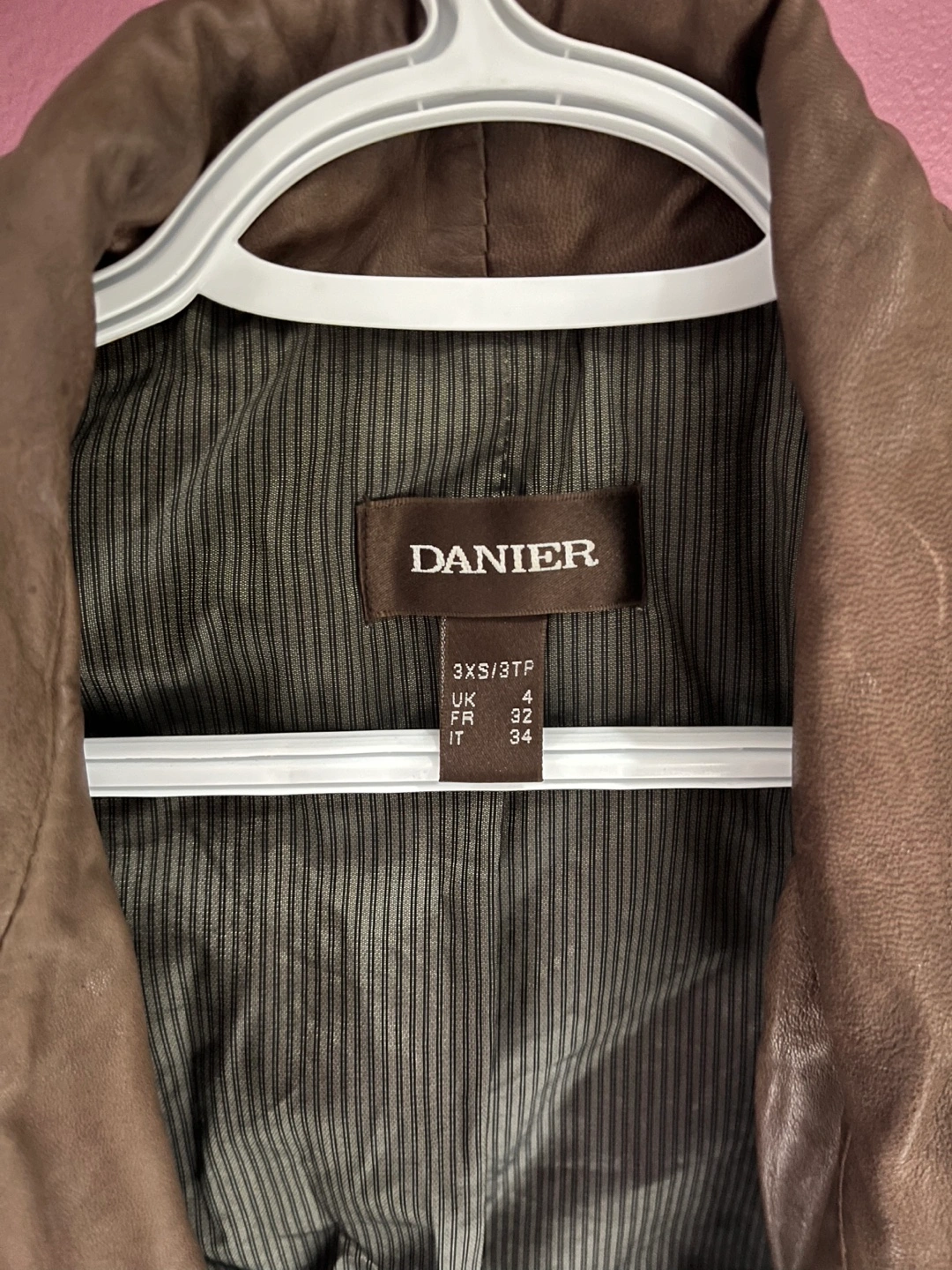 Brown leather jacket with asymmetrical zipper closure. Tag shows size 3xs/UK 4. I’ve included a size chart directly from danier’s website for measurements.
