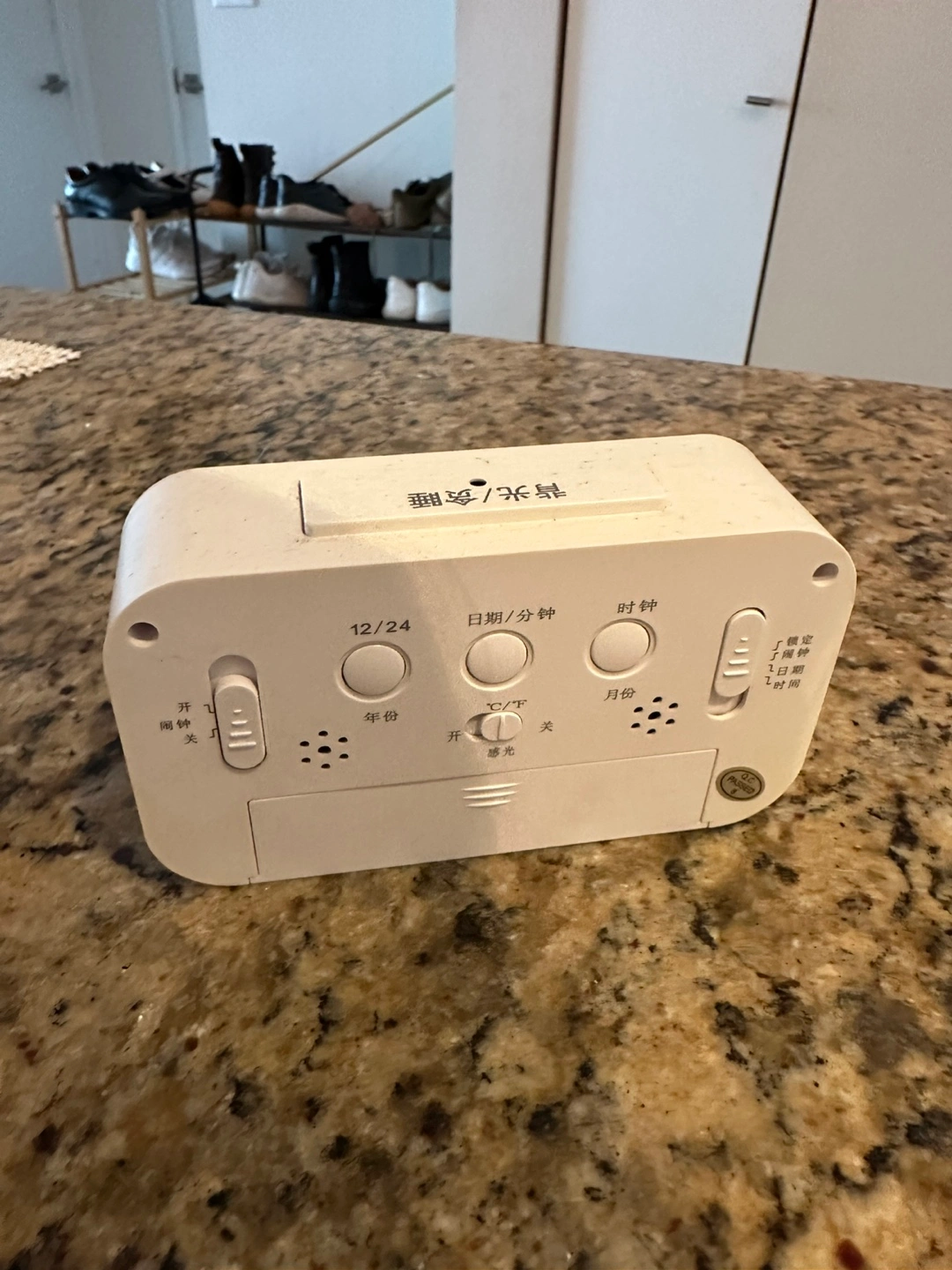 A digital alarm clock. White in color. Appears to have a rectangular display. Great to have by your bedside to help you wake up feeling refreshed every morning.