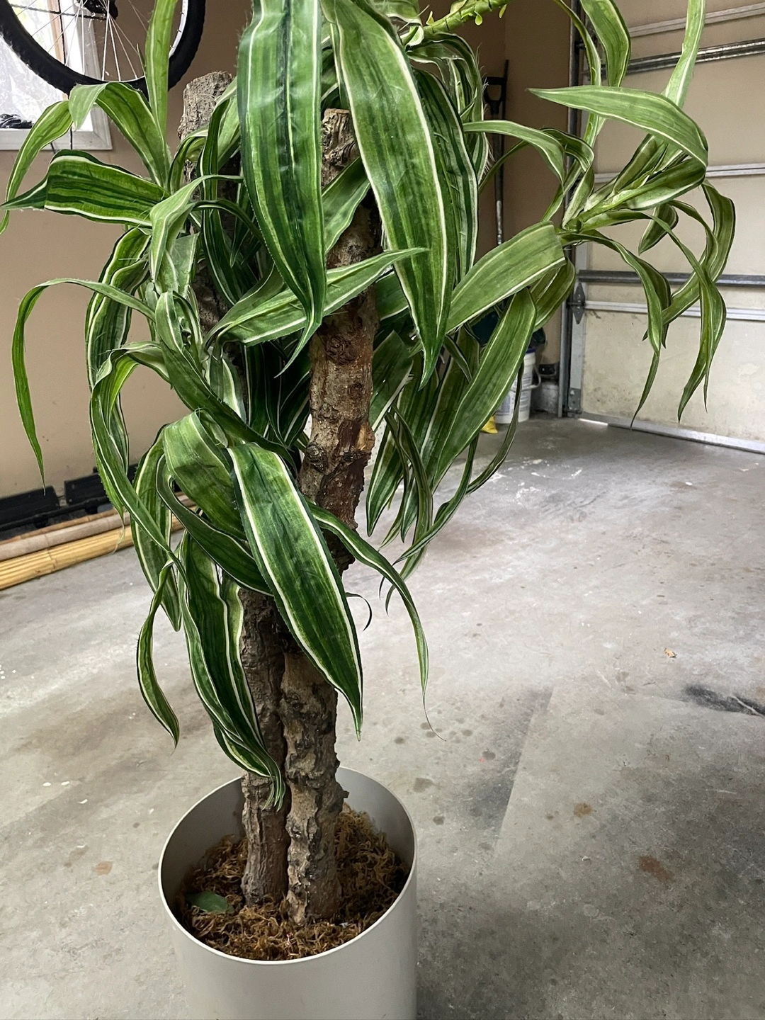 Large indoor plant. Very life -like. Features green leaves with white edges. Comes with a white pot. It's a great addition to any home to bring a sense of calm.