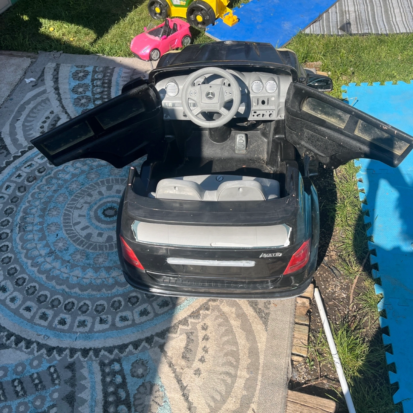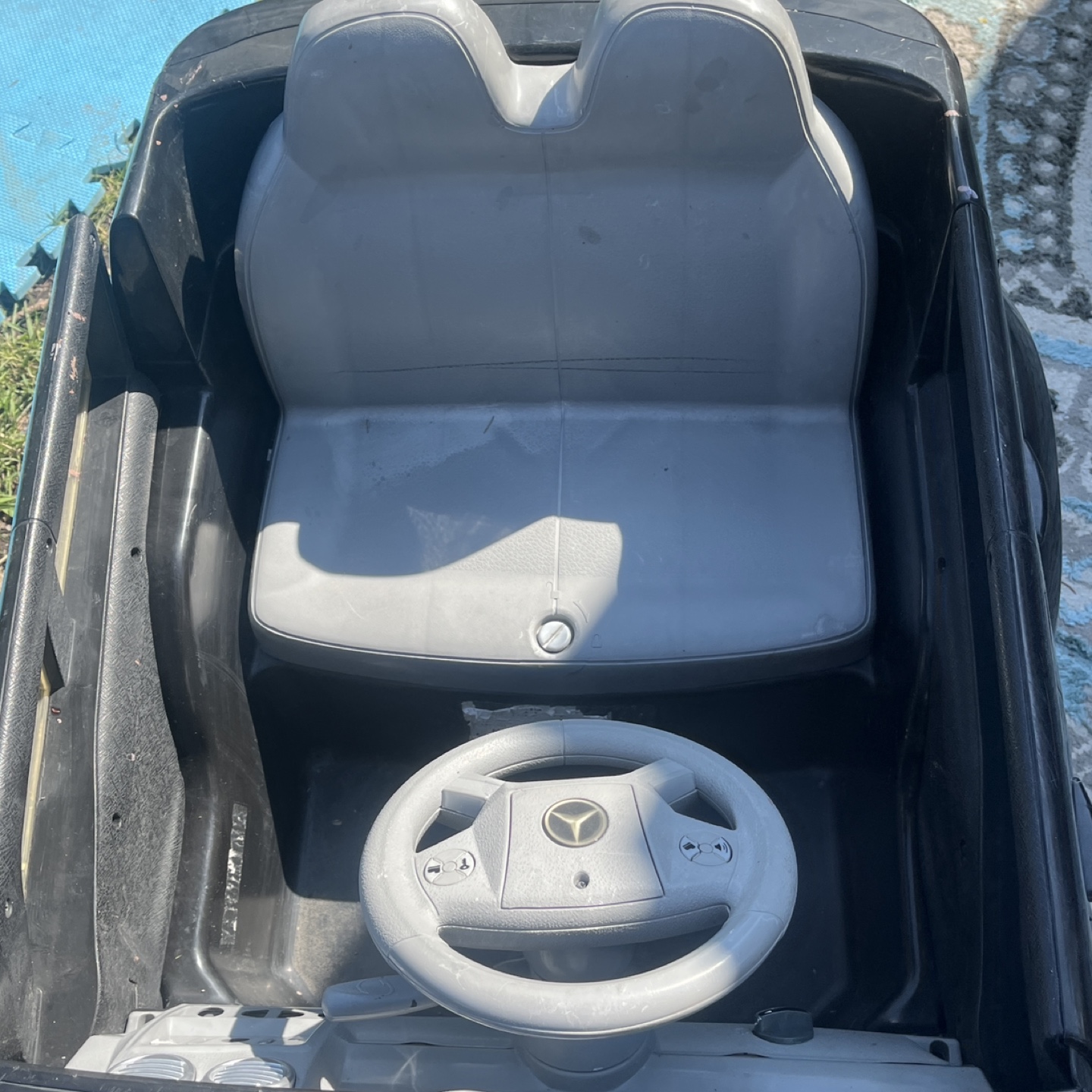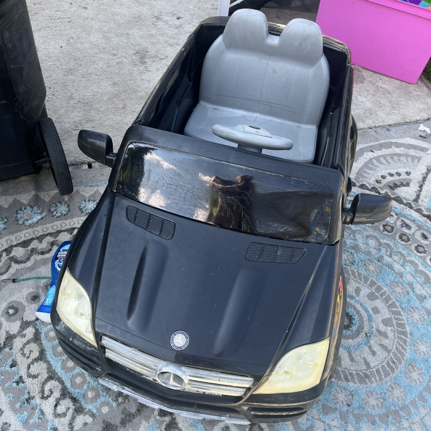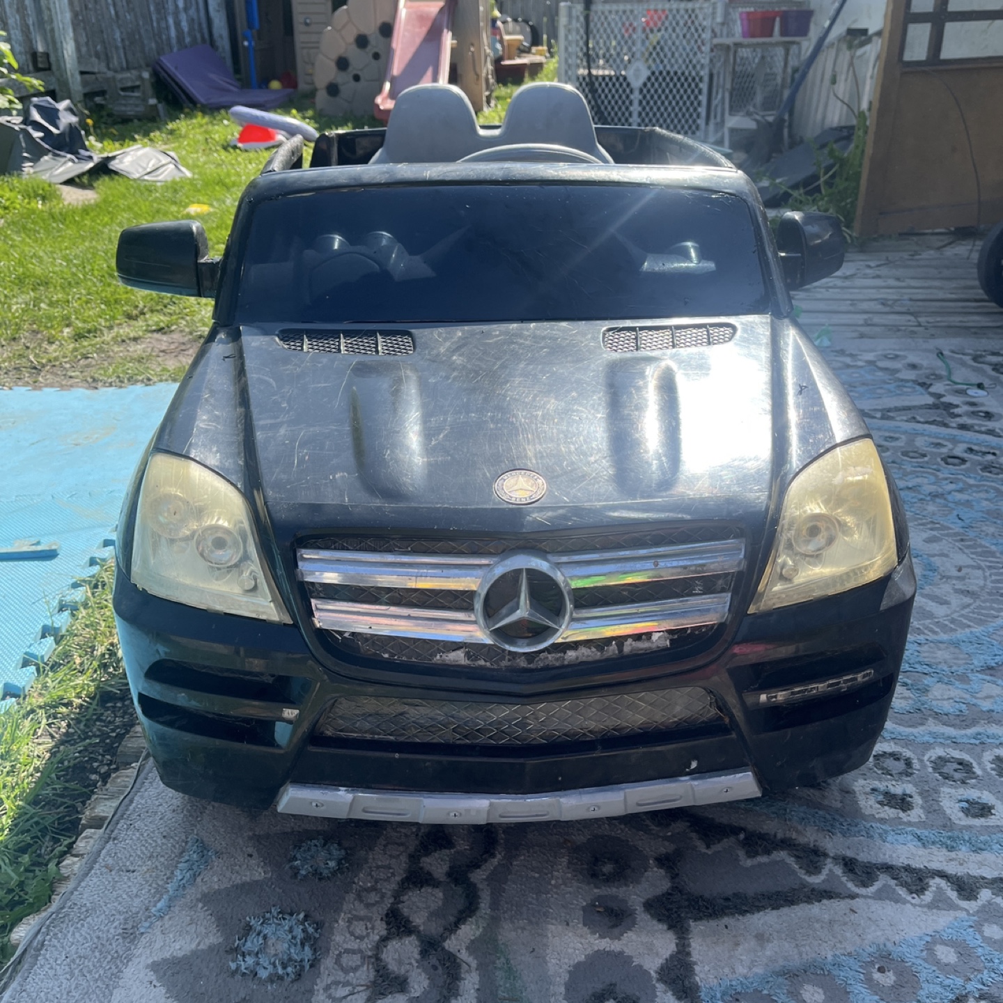 A cool Mercedes-Benz black ride-on car. Featuring a steering wheel and seats. Has side view mirrors and headlights. The car includes battery and charger charger zip tied inside underneath seat so it doesn’t get lost all the functions on the steering wheel work runs perfectly fine stickers are missing, but doesn’t affect the function of the electric car both doors open no major damages or resting or any type of wear underneath a little bit where on the body, but lots of life left. This car would be perfect for your little one to cruise around in peace.