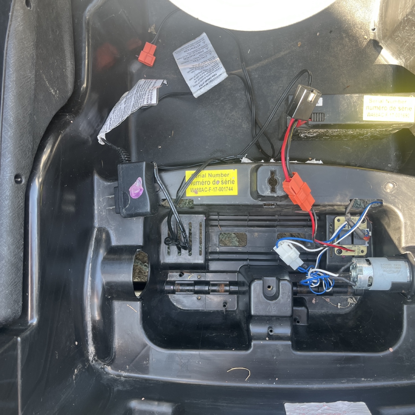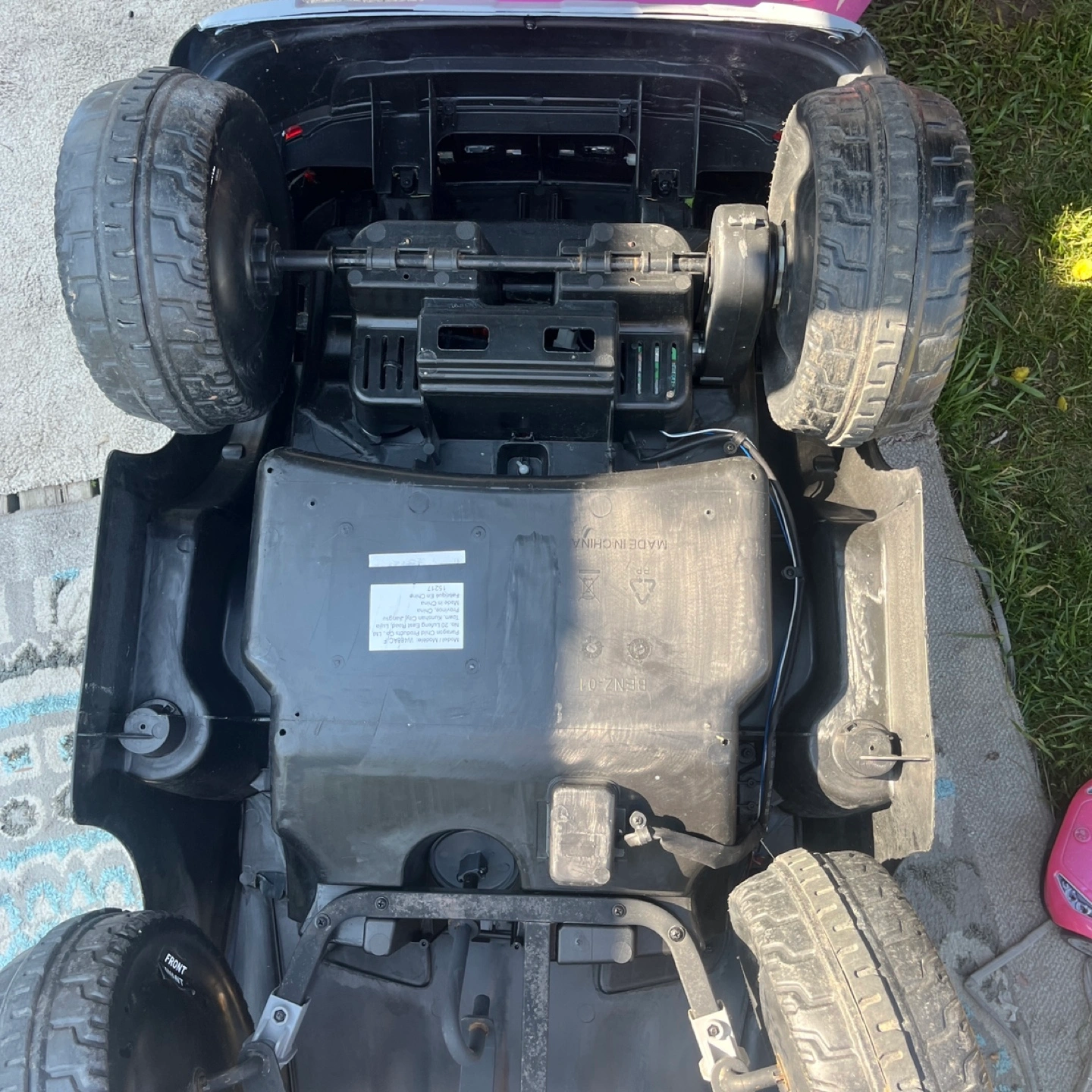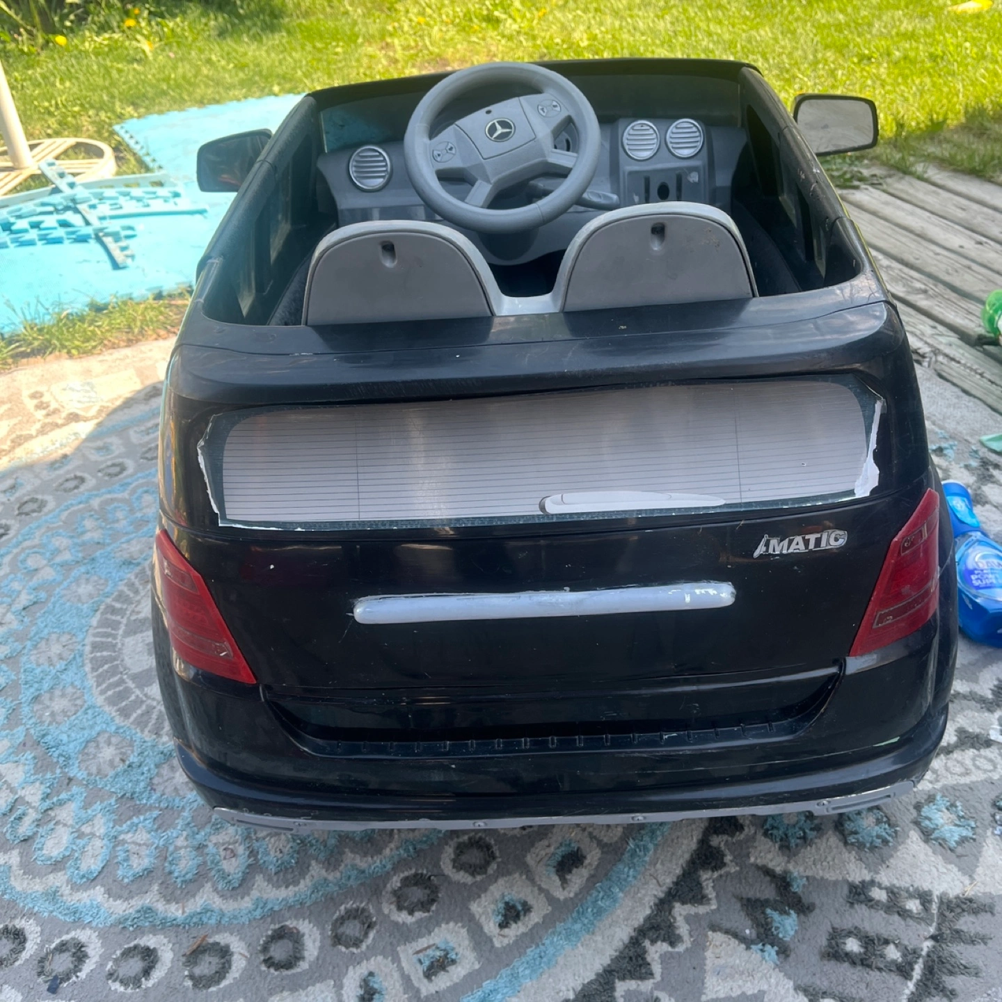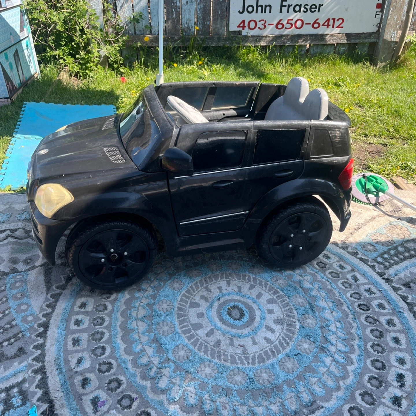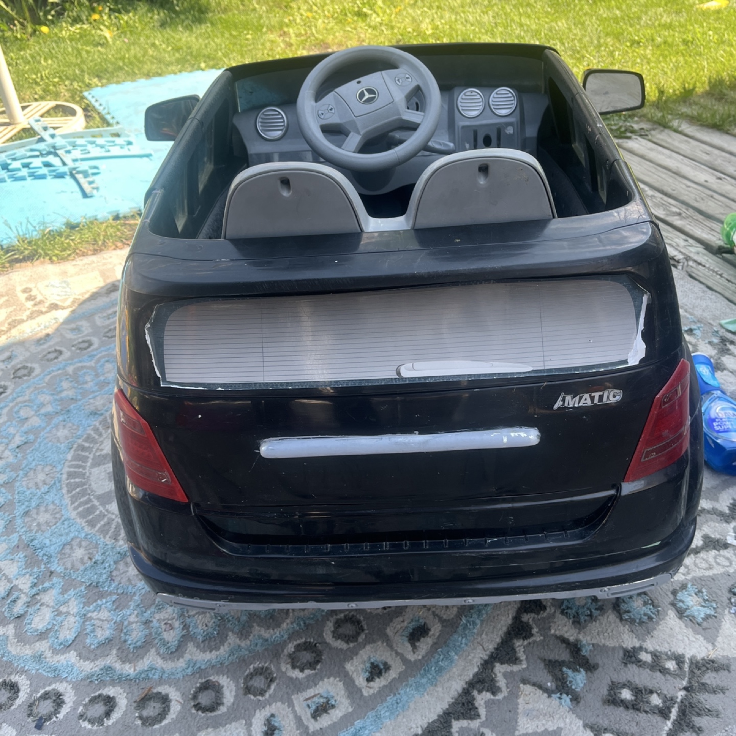 A cool Mercedes-Benz black ride-on car. Featuring a steering wheel and seats. Has side view mirrors and headlights. The car includes battery and charger charger zip tied inside underneath seat so it doesn’t get lost all the functions on the steering wheel work runs perfectly fine stickers are missing, but doesn’t affect the function of the electric car both doors open no major damages or resting or any type of wear underneath a little bit where on the body, but lots of life left. This car would be perfect for your little one to cruise around in peace.