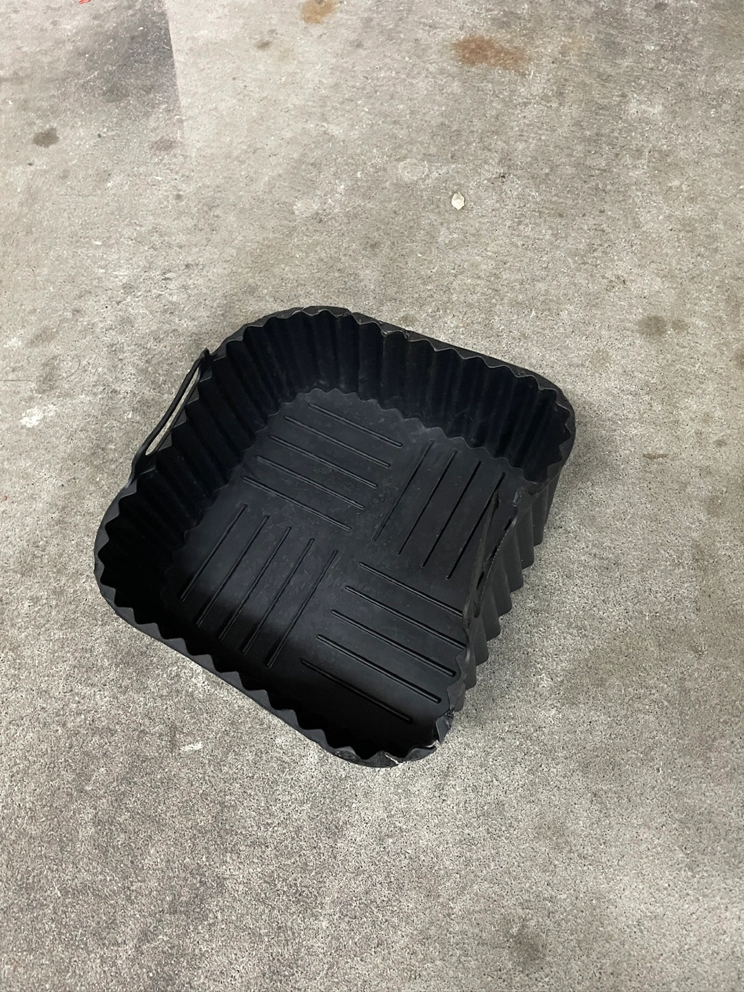 Black silicone tray insert for air fryer for easy cleaning. One side of handle wis off but will not interfere with its function