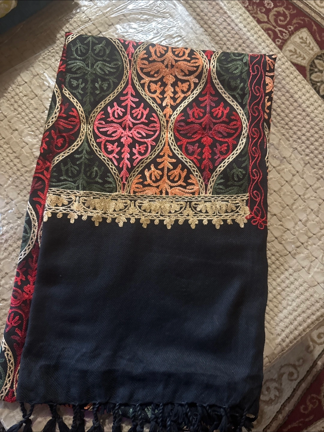 A beautiful shawl with intricate embroidery. It has a black base, and the patterned details have colours of red, green, and orange. The border of the shawl has a gold embroidered trim with tassels on the bottom edge, it would be perfect to keep you warm and cozy.