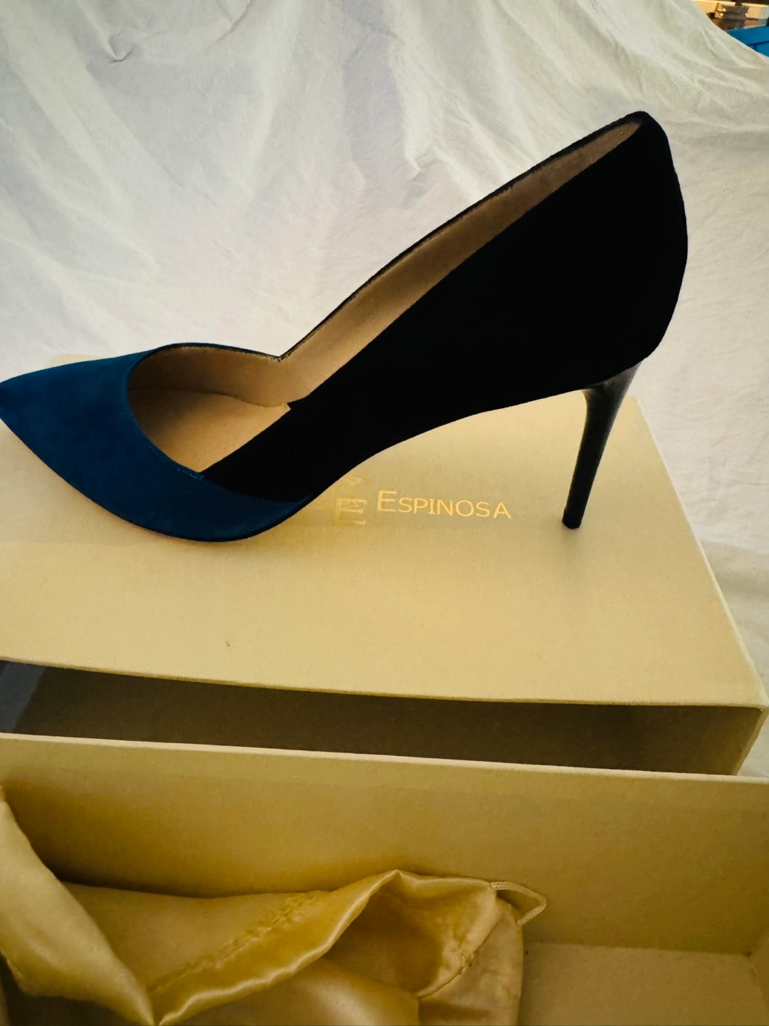Lovely pumps, two-toned. Featuring a heel. Suede material and the original box, the shoes come with a dust bag. Can be worn for the office or formal wear. Wearing these can bring peace to your busy days.