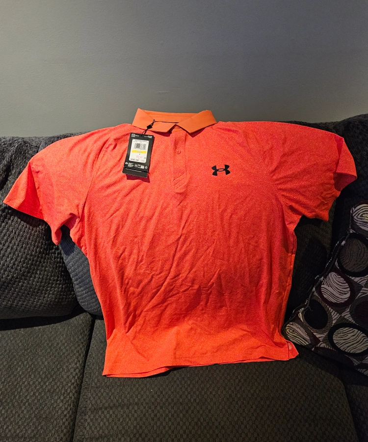 58Bright orange polo shirt. The collar is a darker shade of orange. Features a three-button placket. The shirt has the Under Armour logo. Perfect for a nice casual day out.