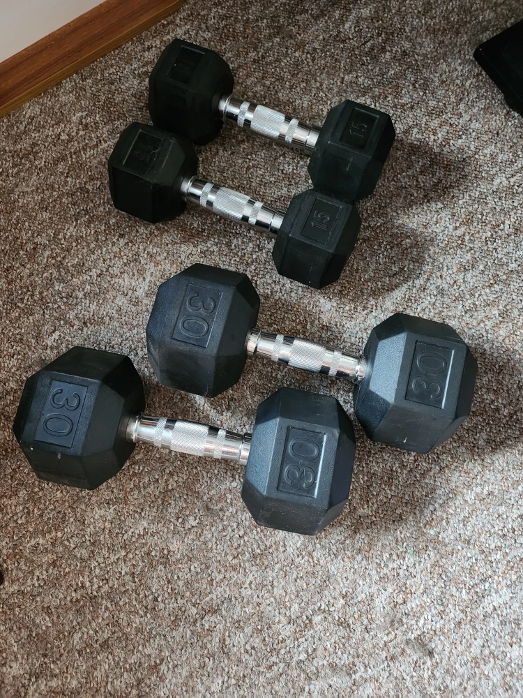 Includes multiple dumbbells of varying weights. Also includes an exercise ball and pump. These items are perfect for an at-home workout.