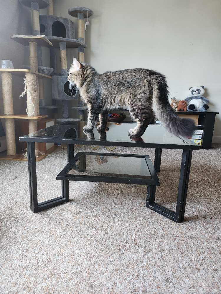 A coffee table. It features a black metal frame. The table includes upper andlower shelf made of glass. The paint is chipped at some spots but its very sturdy!